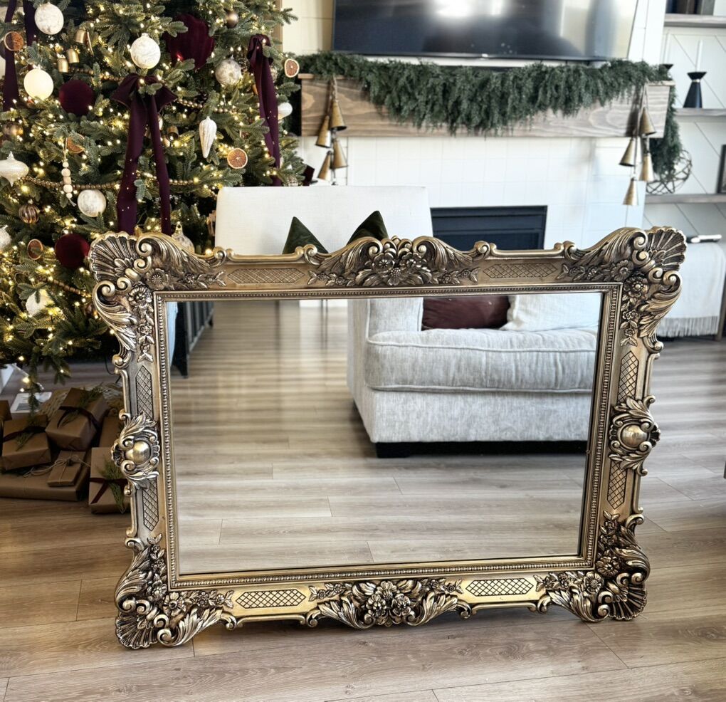 Great Condition | Vintage | Orate | Faux Gilt | Plastic | Gold Framed Mirror | Entry | Entryway Table | Bathroom | Living Room | Bedroom | Dining Room | Traditional Style | Retro | 1900’s | Hang Long or Wide | Gorgeous Details | Character | Charm | Home Staging | Gallery Wall | Fireplace Mantle | Console Table | Guest Room | Home Office | European Style