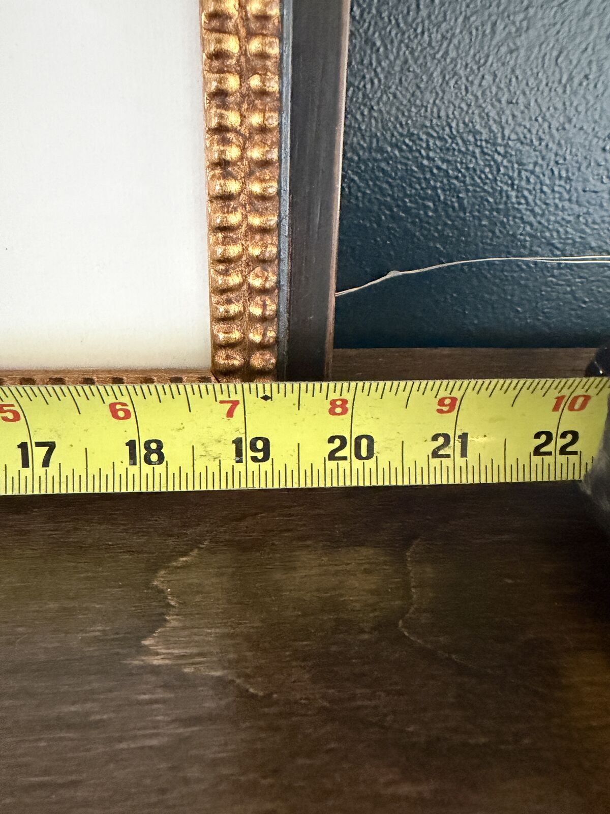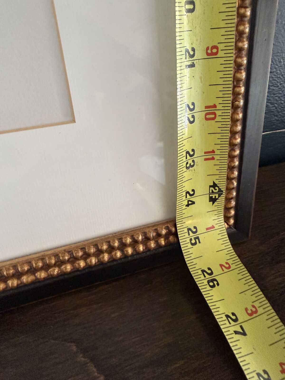 Frame: Metal frame with raised gold beading and dark edging, glass front