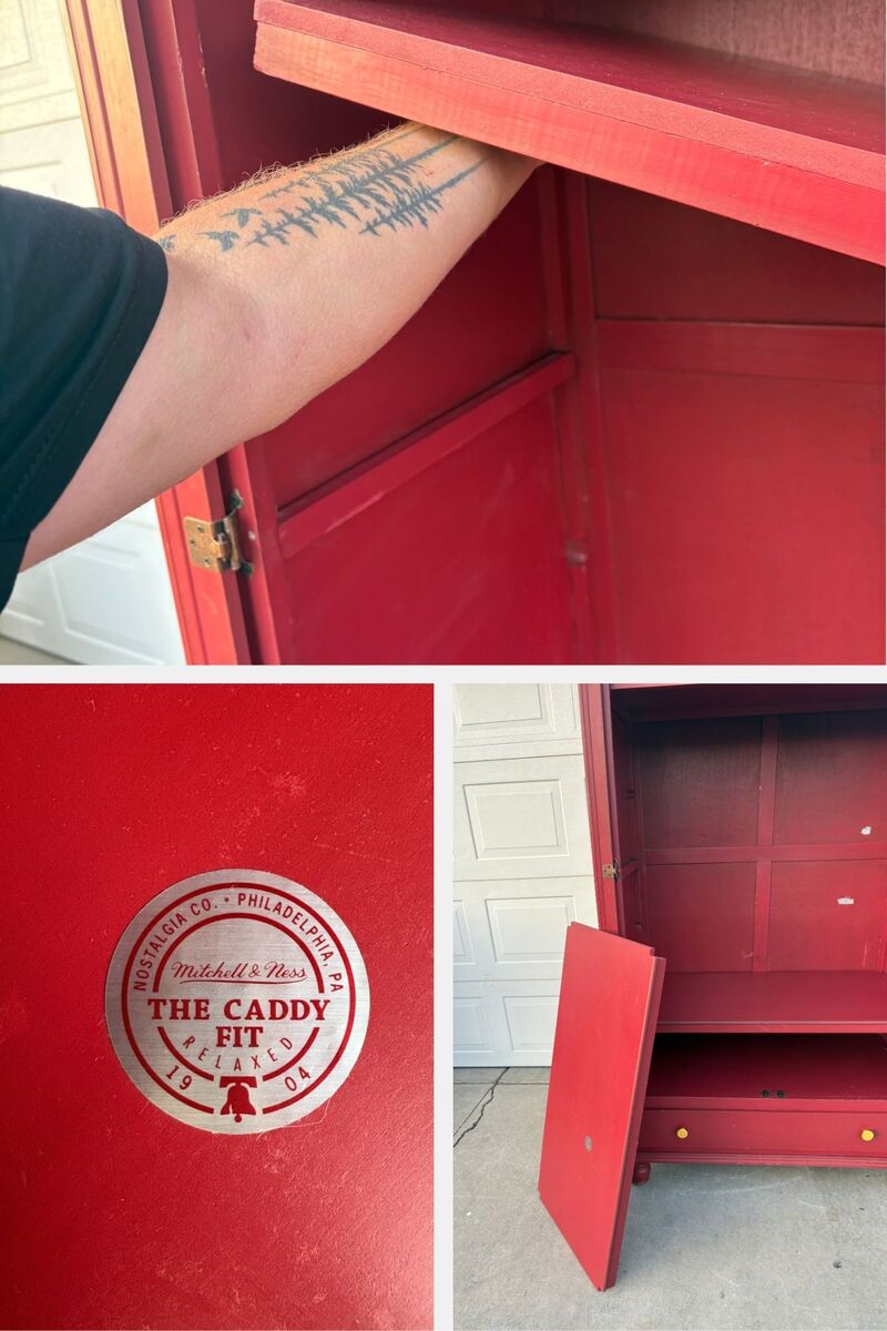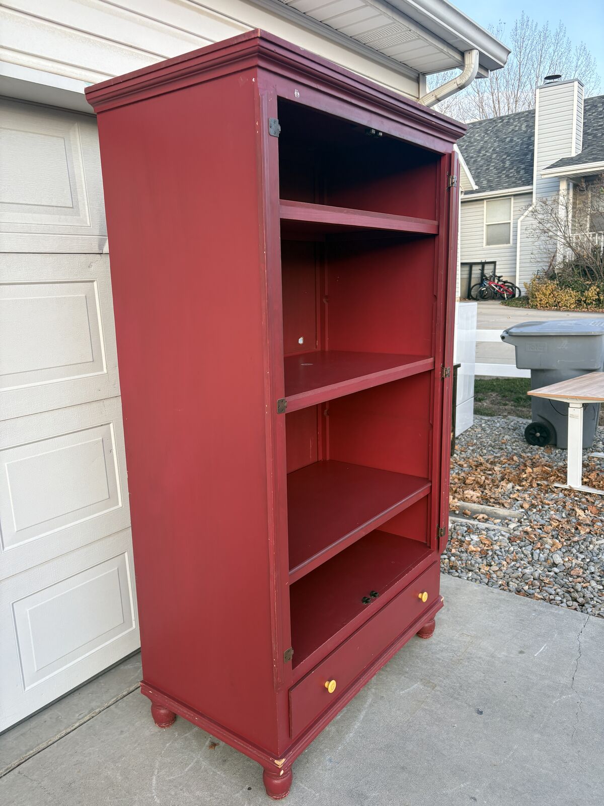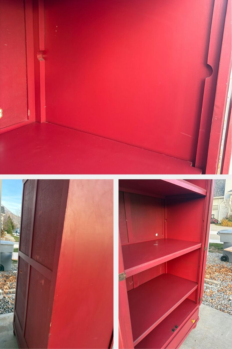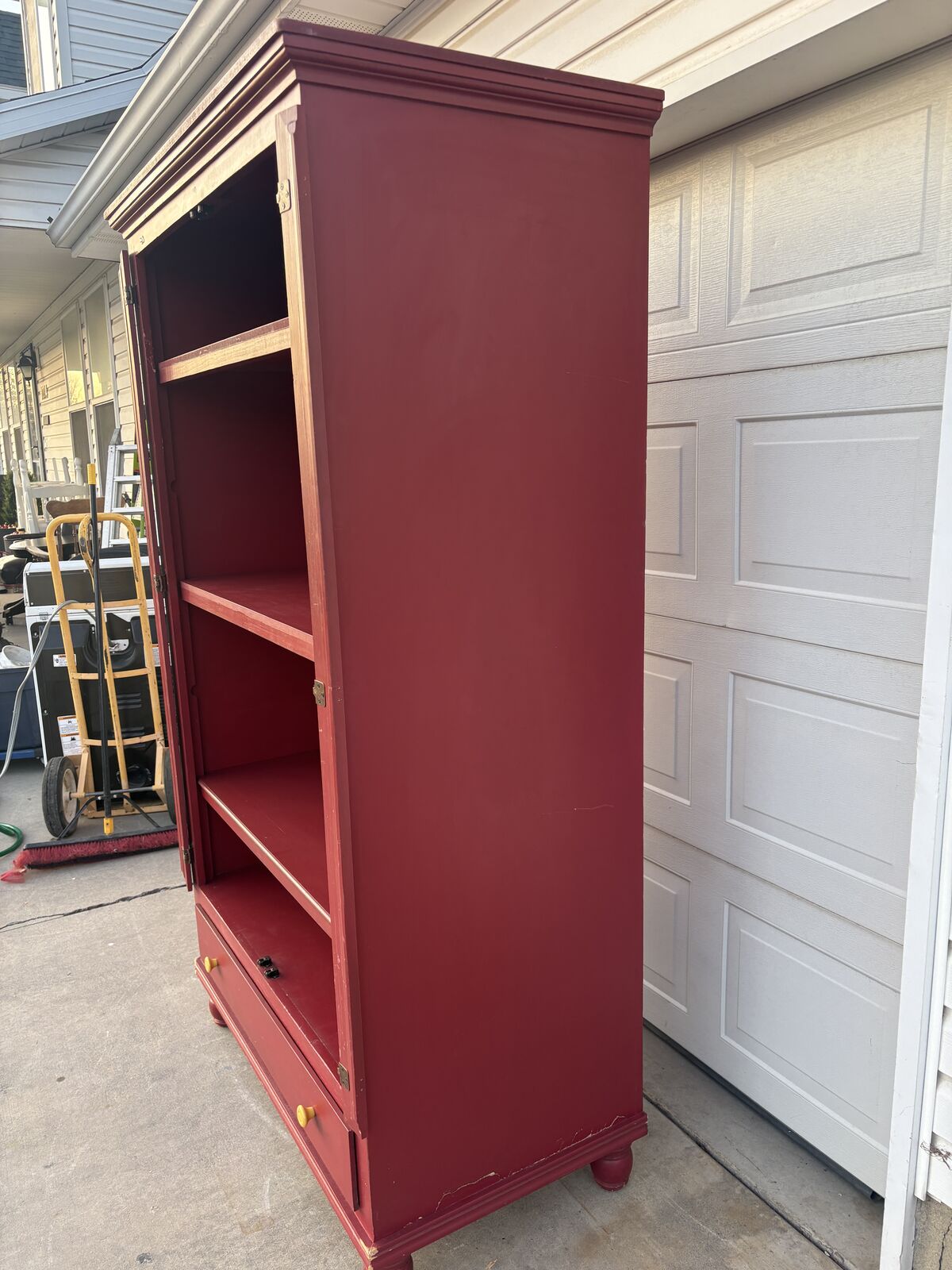 ApplePayBright red solid wood armoire with tons of storage and character. Perfect for a kids’ room, craft room, entryway, pantry, or TV / gaming storage cabinet. Dimensions are approximately 80 tall x 46 wide x 25 deep. Details Sturdy wood construction with classic crown molding and turned feet Three large shelves plus an open lower compartment Full-width bottom drawer with yellow knobs for extra storage Some scuffs and dings in the paint, but structurally solid and ready to use or refinish to your style Description: Red wood armoire in good used condition with lots of storage options. Inside has 3 fixed shelves, open space at the bottom, and a large pull-out drawer with yellow knobs. Doors and hinges work well; paint has some wear and small chips, which actually give it a rustic, vintage look. Overall dimensions are about 80 (H) x 46 (W) x 25 (D). Would be great for toys, linens, pantry storage, craft supplies, or as a media cabinet. From a smoke-free home. Piece is heavy and solid.