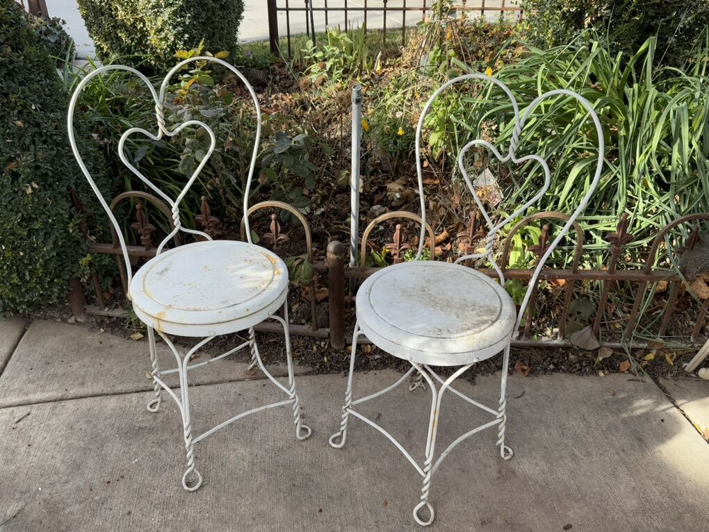 (2) vintage all metal white heart chairs price for pair.