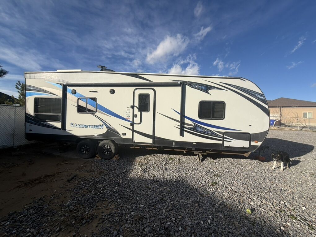 2019 Forest river Sandstorm 242gslc Toy hauler Just over 30 feet 13’9 garage Fits my Polaris general 4 seater and RZR Always washed and cleaned after every trip Onboard generator and fuel station. Happy jack electric bed Powered stabelizer jacks New tires in 2024 Currently winterized Has solar hooked up and works great Has winter cover I’ll include I’ll include my full equalizer hitch set up. 146 G fresh water 65 g gray water 40 G black water 10 gallon elec/gas dsi water heater