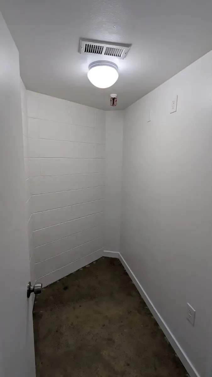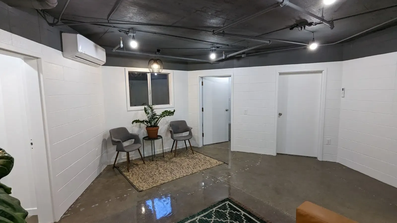 Newly remodeled office about 650 sqft with cement floors, exposed wood ceiling, Storage closed and 2 offices, shared bathroom down the hall.
