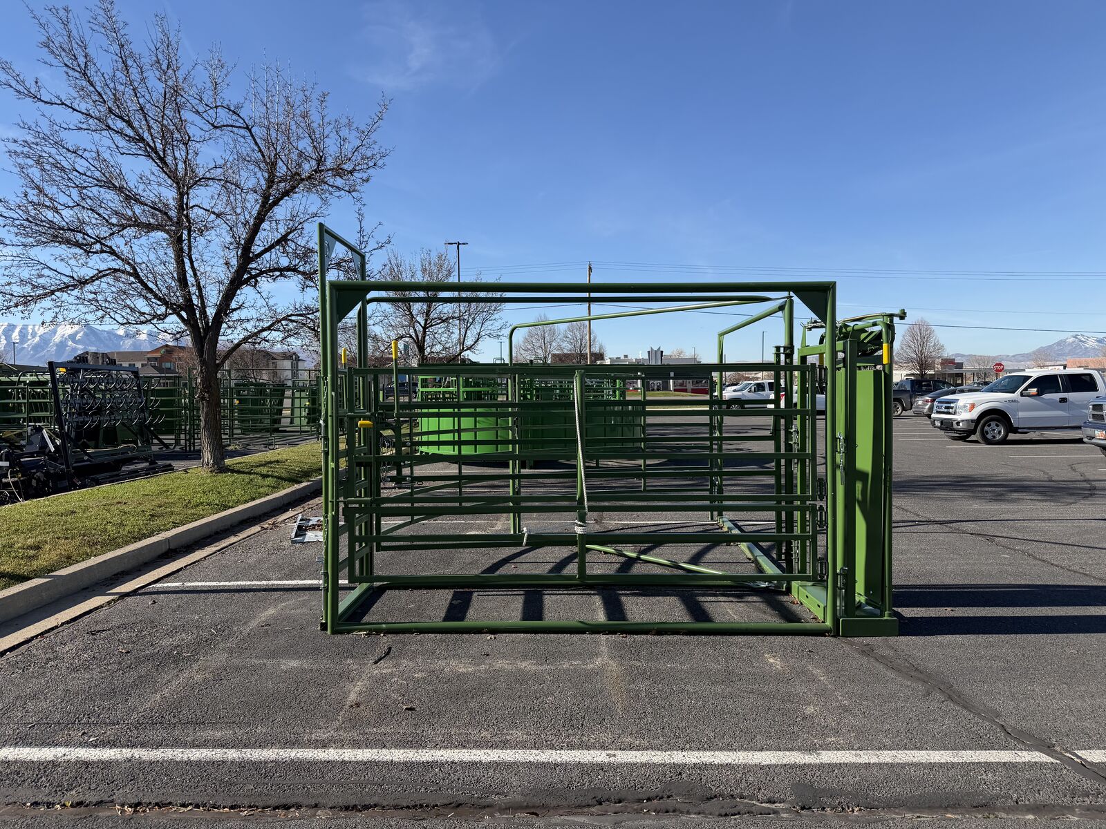 Powder River Homesteader Calving Pen. Acts as a holding pen to contain cows close to calving. Sweep panels allow for containment of cow and panel on opposite side splits to allow calves to nurse. Automatic head catch makes it easy to use alone and has third access point on back end for accessability when preg checking or pulling a calf. Automatic stop on sweep panels prevent cow from turning back. Side exit gives cow another way out of the pen. Pen consists of separate pieces so must be taken apart when moved.