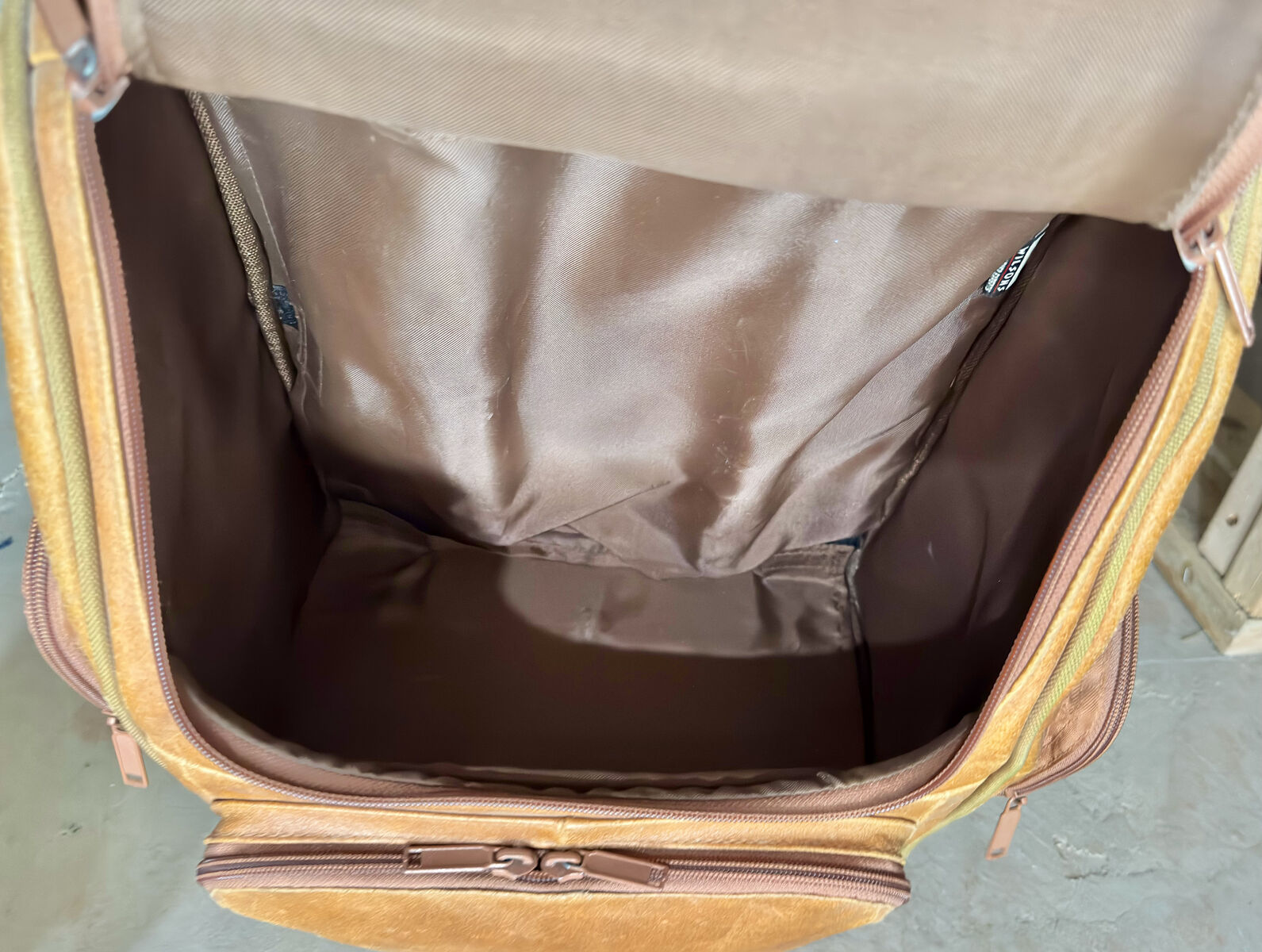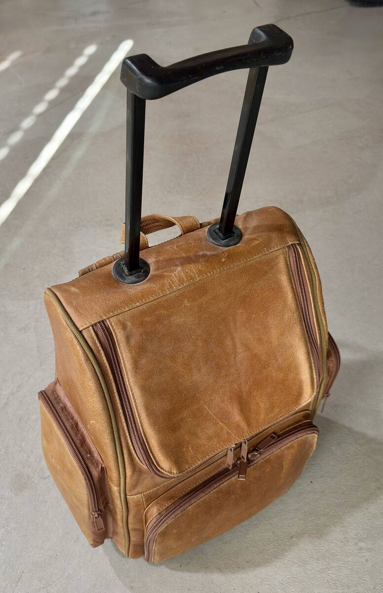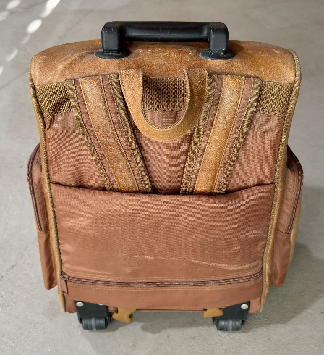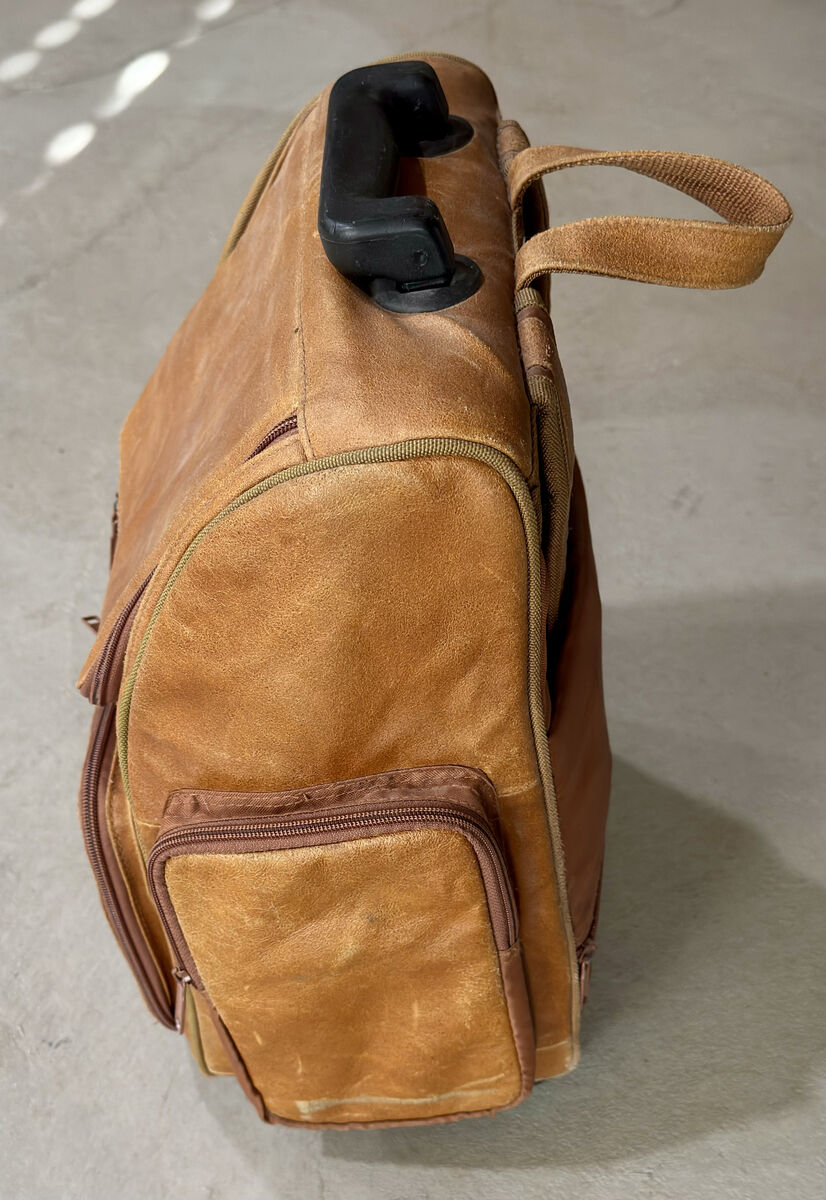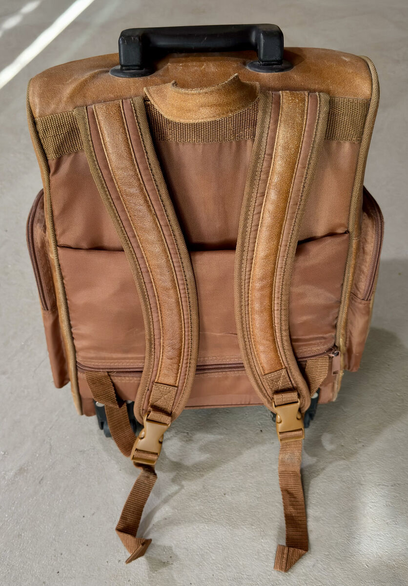 This is a beautiful and unique tanned leather rolling backpack, computer case, overnight bag in excellent condition with just a few minor scuffs on the leather surface (see photos)