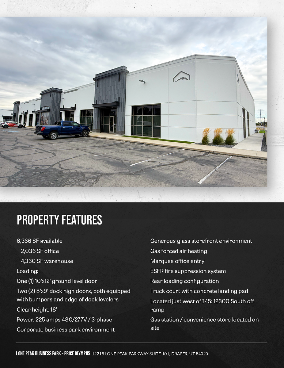 Position your business in the heart of Draper’s premier industrial park with 6,366 SF of high-quality office and warehouse space. Featuring multiple loading doors, modern office finishes, and unbeatable access to I-15, this suite is built for efficiency and growth.
