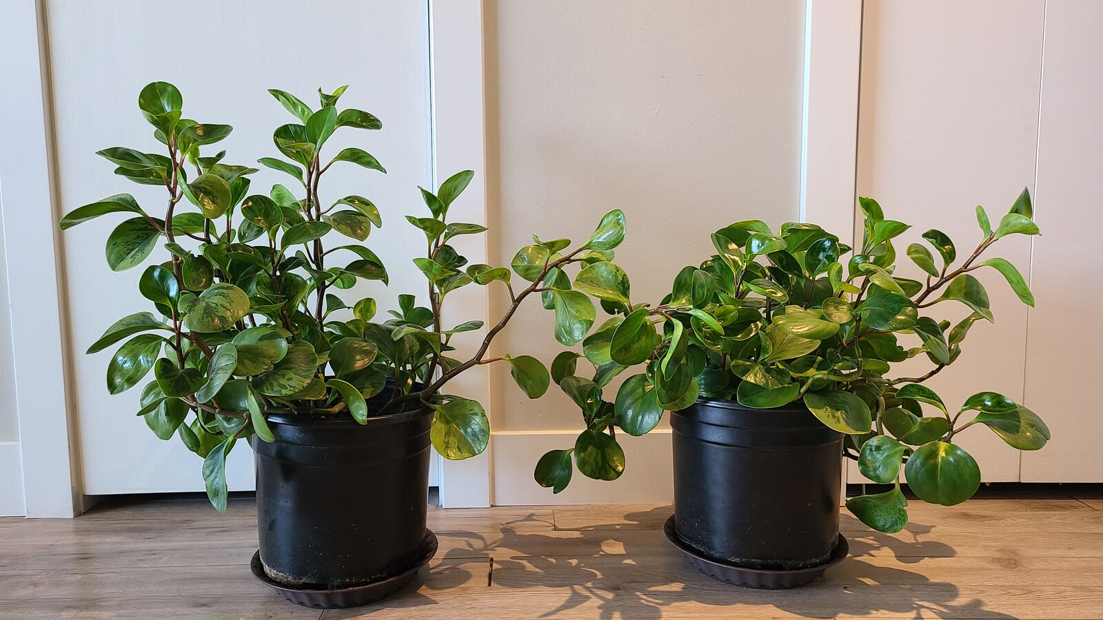 Peperomia obtusifolia, also known as the baby rubber plant, American rubber plant, or pepper face. Two plants. 5 years old. 26" high. $ 50 each.