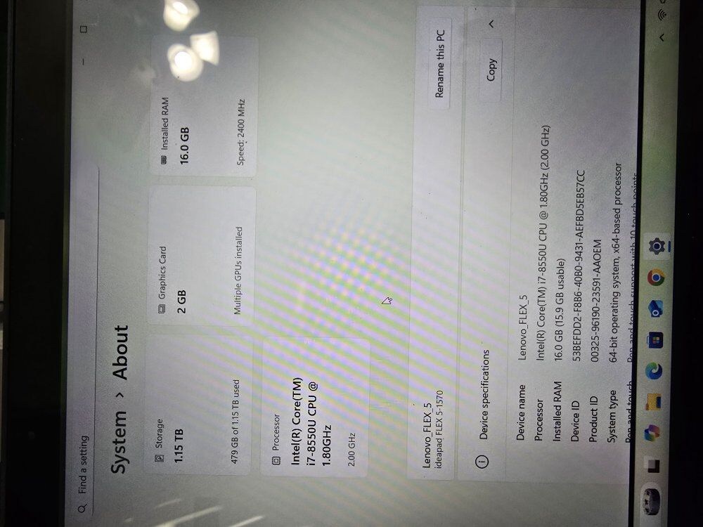 Key specifications; Processor: 8th Generation Intel Core i7-8550U RAM: 16GB DDR4 Storage: 512GB Toshiba NVME Storage2: 750GB Samsung SATA Display: 15.6-inch IPS touchscreen with 1920x1080 (Full HD) Graphics: Dedicated 2 GB NVIDIA GeForce MX130 Operating System: Windows 11 Home 25H2 - THE VERY LATEST! Connectivity: Wi-Fi (802.11ac or Wi-Fi 5), Bluetooth 4.1 Ports: USB 3.0, HDMI, 4-in-1 media card reader Webcam: 720P HD camera This also has a "Pen" similar to the Apple Pencil. This folds over like a tablet, however, I have never used it like that. Don't befooled! This came in multiple configurations. This is the upper configuration! The Lenovo Ideapad Flex 5-1570 (model 81CA) has multiple configurations, but common specs include:\