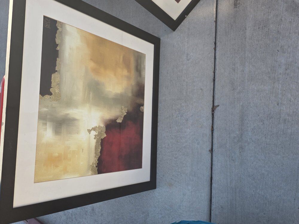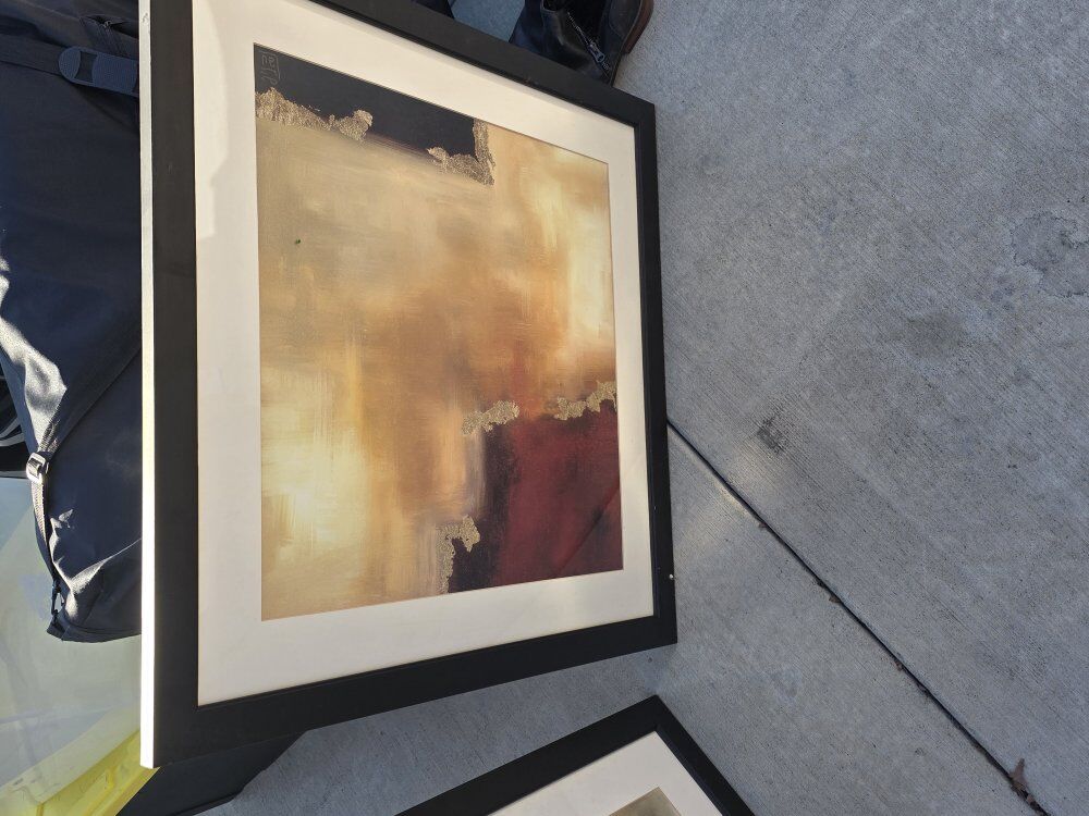 Beautiful large modern abstract wall art in excellent used condition. Each piece measures approximately 33” x 33” and is professionally framed in a black frame with white matting. Neutral tones with gold/metallic accents—perfect for a living room, office, bedroom, or entryway.