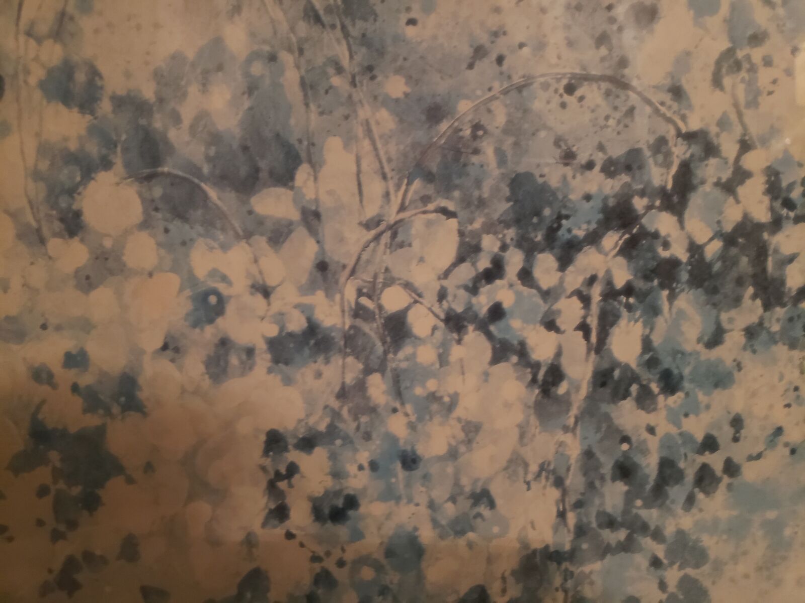 Professional Mounted Large Impression "Stones and Ivy" Framed Art behind glass with double mat in shades of blue and gray.