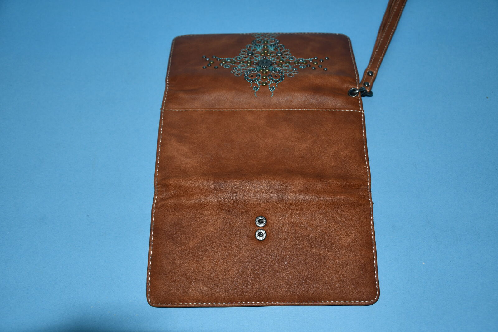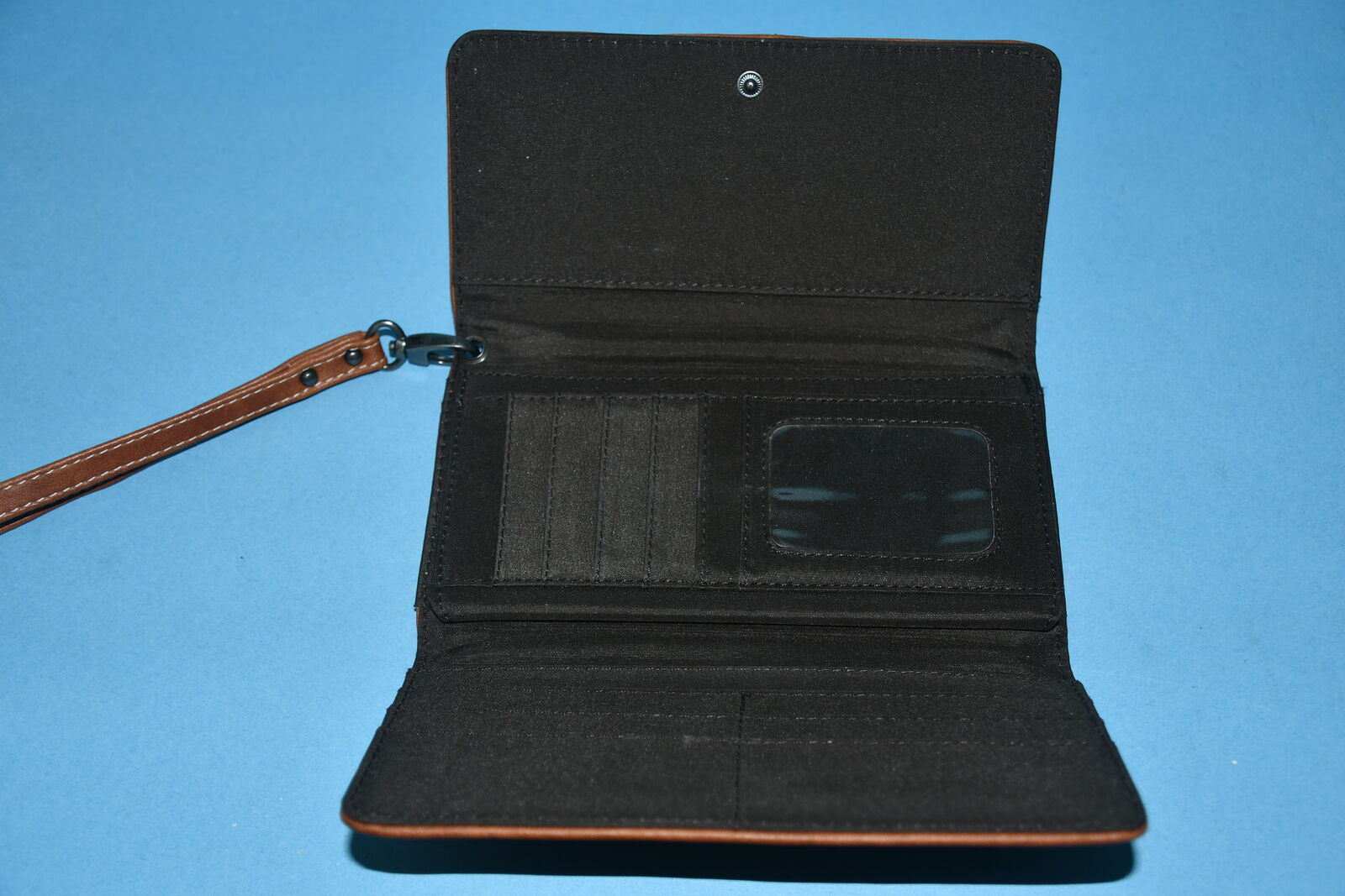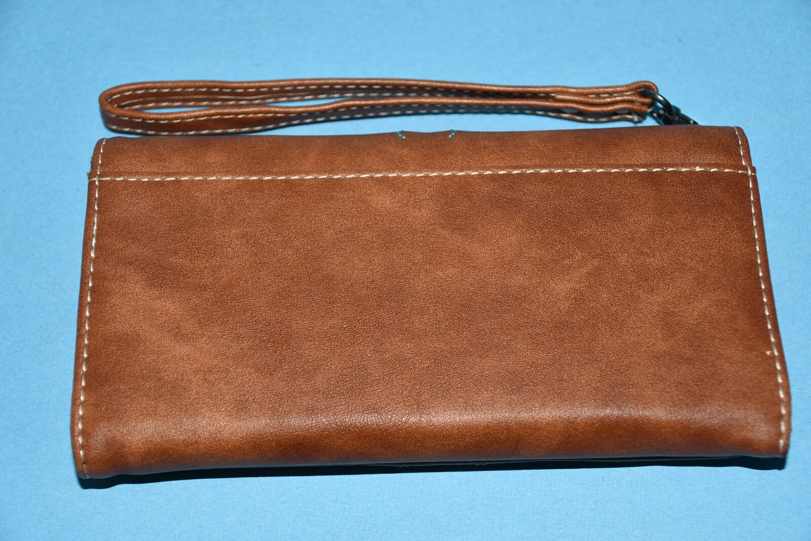 This WOMEN'S WESTERN BROWN WALLET/ WRISTLET is about 7.5" x 4" x 1". It has an ID slot & multiple credit card slots. There is a slip pocket in the back. It has a snap closure. It is CLEAN! Questions??? Please ask. We are located in Plain City. Cash only please.
