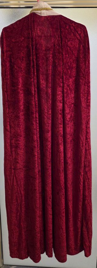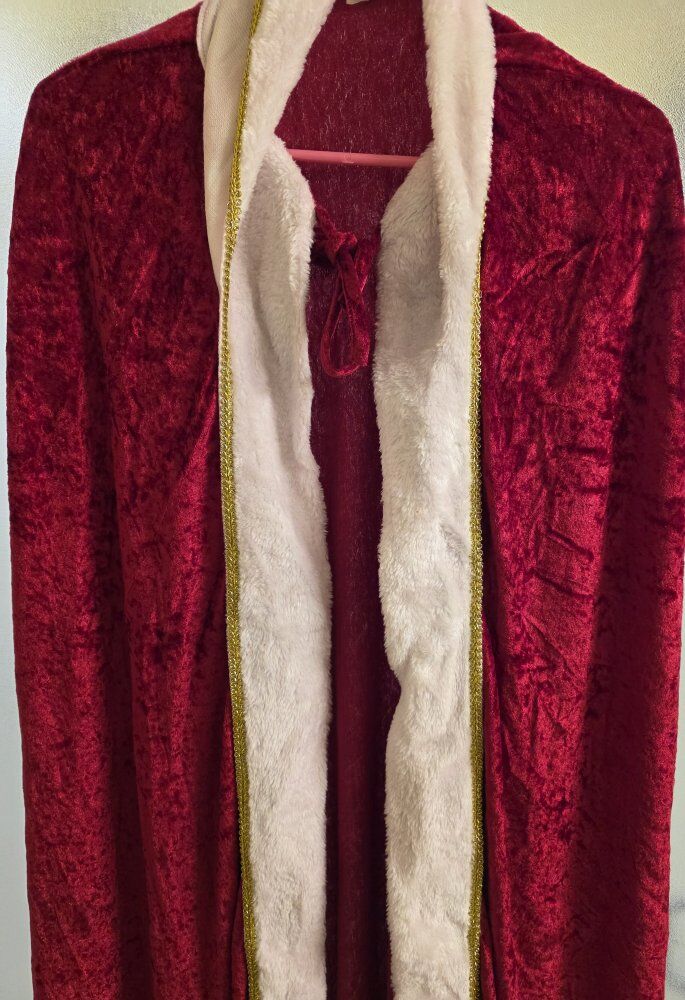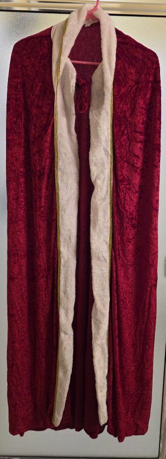 Perfect addition to the holiday season. Add to your festive look with this Mrs. Clause Cload. No sleeves, fits most, very long red robe with faux fur trim.