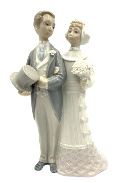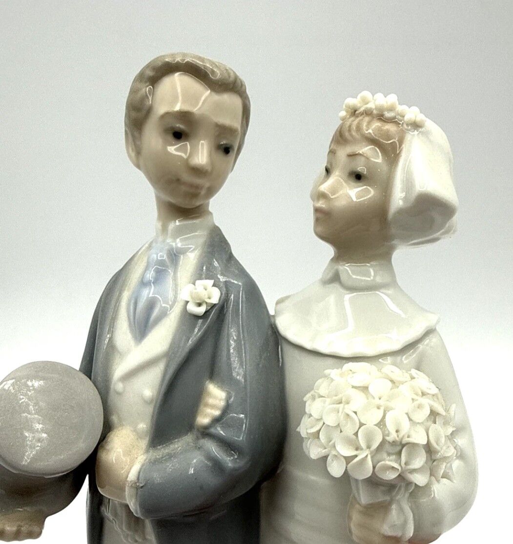 Vintage Lladro Wedding Day is a Spanish Gloss Finished porcelain figurine depicting a young Bride and Groom, a timeless portrayal of innocence and affection. Celebrate a timeless tradition of love and partnership with the exquisitely crafted Bride and Groom Figurine. This piece, introduced in 1972 and sculpted by the renowned artist Julio Fernandez, captures the elegance and emotion of a bride and groom's first embrace on their special day. Beautifully detailed with soft Gloss finish, the figurine embodies a serene and timeless charm, making it a lovely addition to any collection. Handcrafted in Spain, this piece reflects the exquisite artistry for which Lladro is renowned. This item does not have its box.