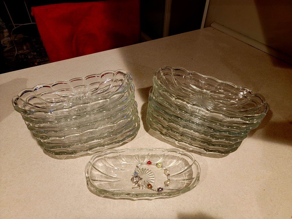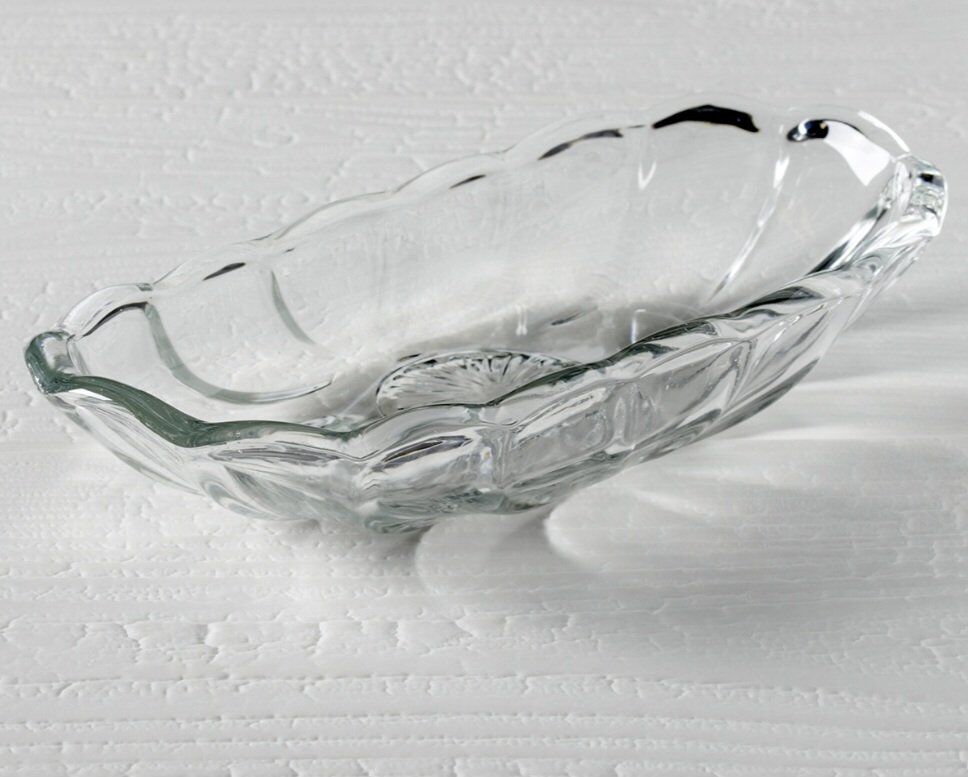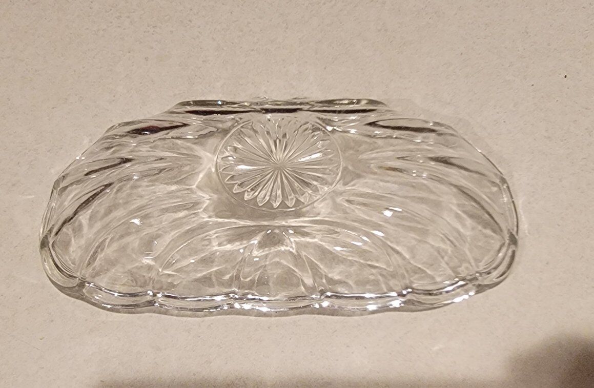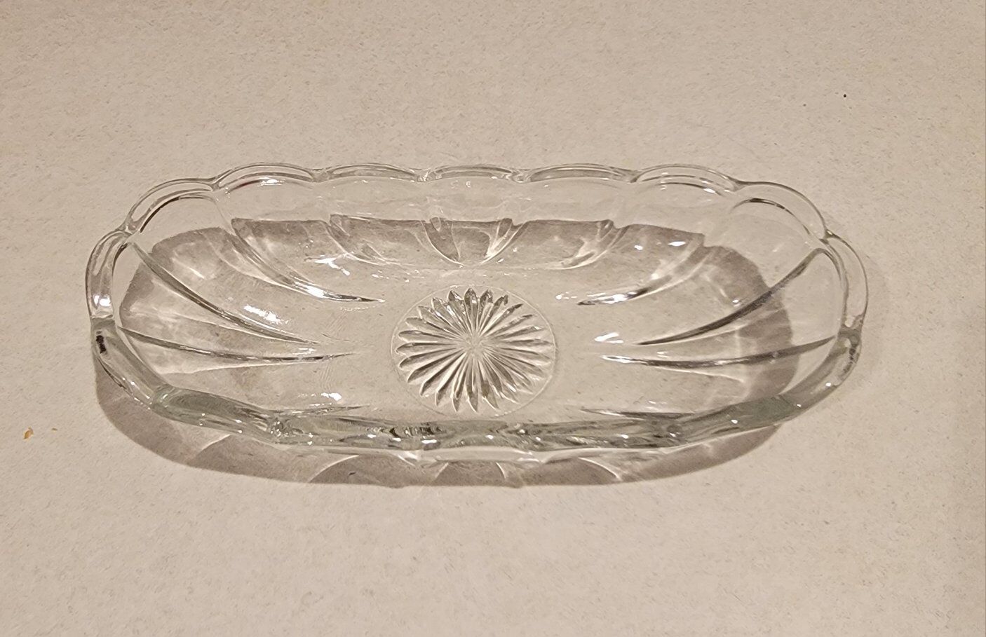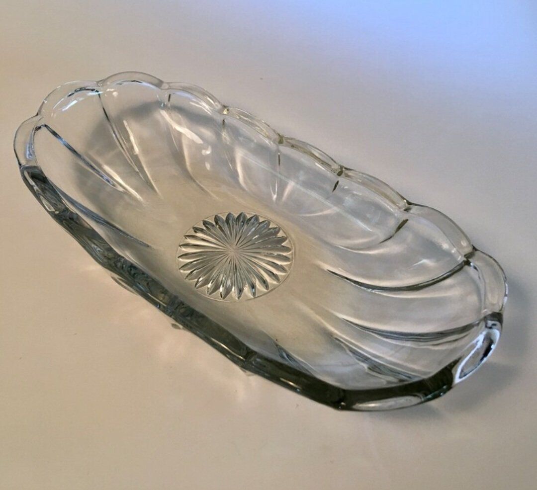The Anchor Hocking Banana Split Dish is a vintage clear glass oval-shaped dish featuring a starburst design in the center. The pressed glass dish is a perfect addition for those who appreciate Mid-Century Modern style. With its etched patterns and glossy finish, this original Banana Boat dishes are a nostalgic piece that brings a touch of retro charm to any collection.