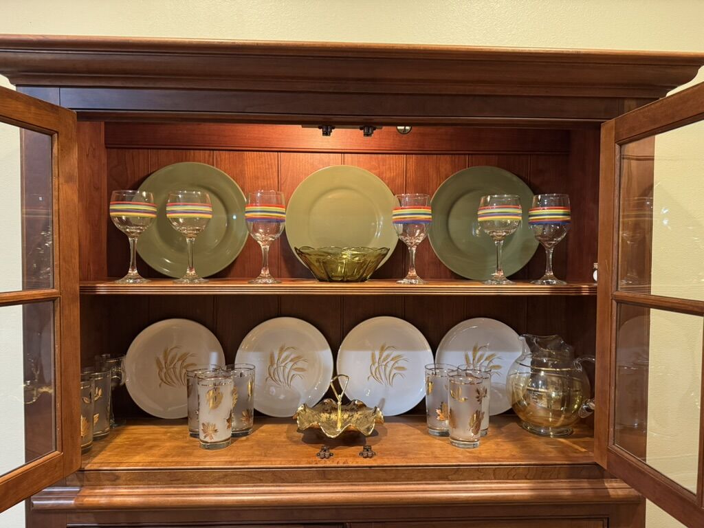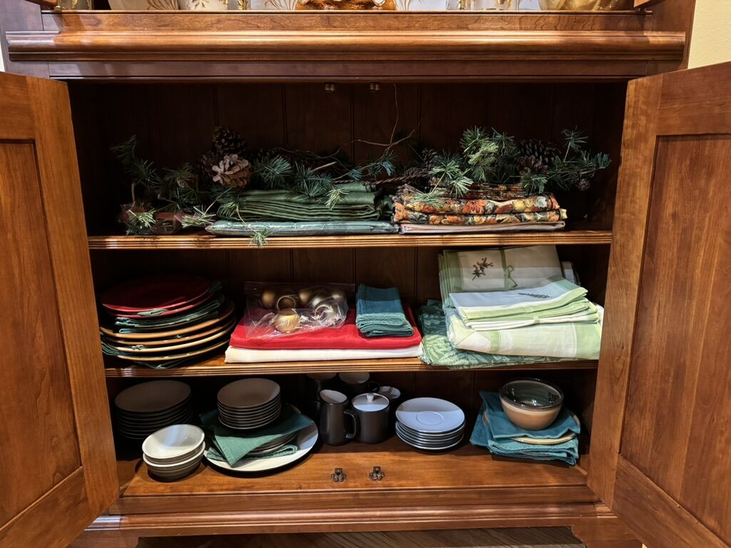 VenmoExcellent condition. Lots of detail. Upper glass-fronted shelves are lighted with plate holders. Lower cabinet has shelves to store table linens. No dents or scratches, just a little wear and tear on the bottom edge. Nice and tall so looks great with high or vaulted ceilings.