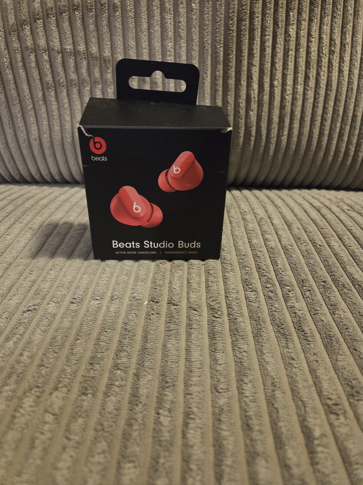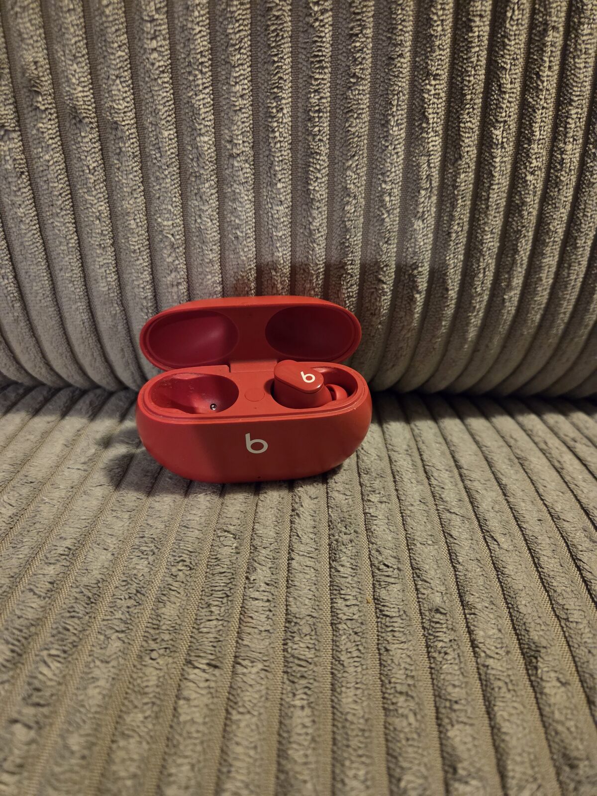 VenmoBeats by Dre Bluetooth beats studio buds. Red. Original box includes charging case, charging cord and 1 bud (right ear). Dropped left ear bud in toilet. 1 year.