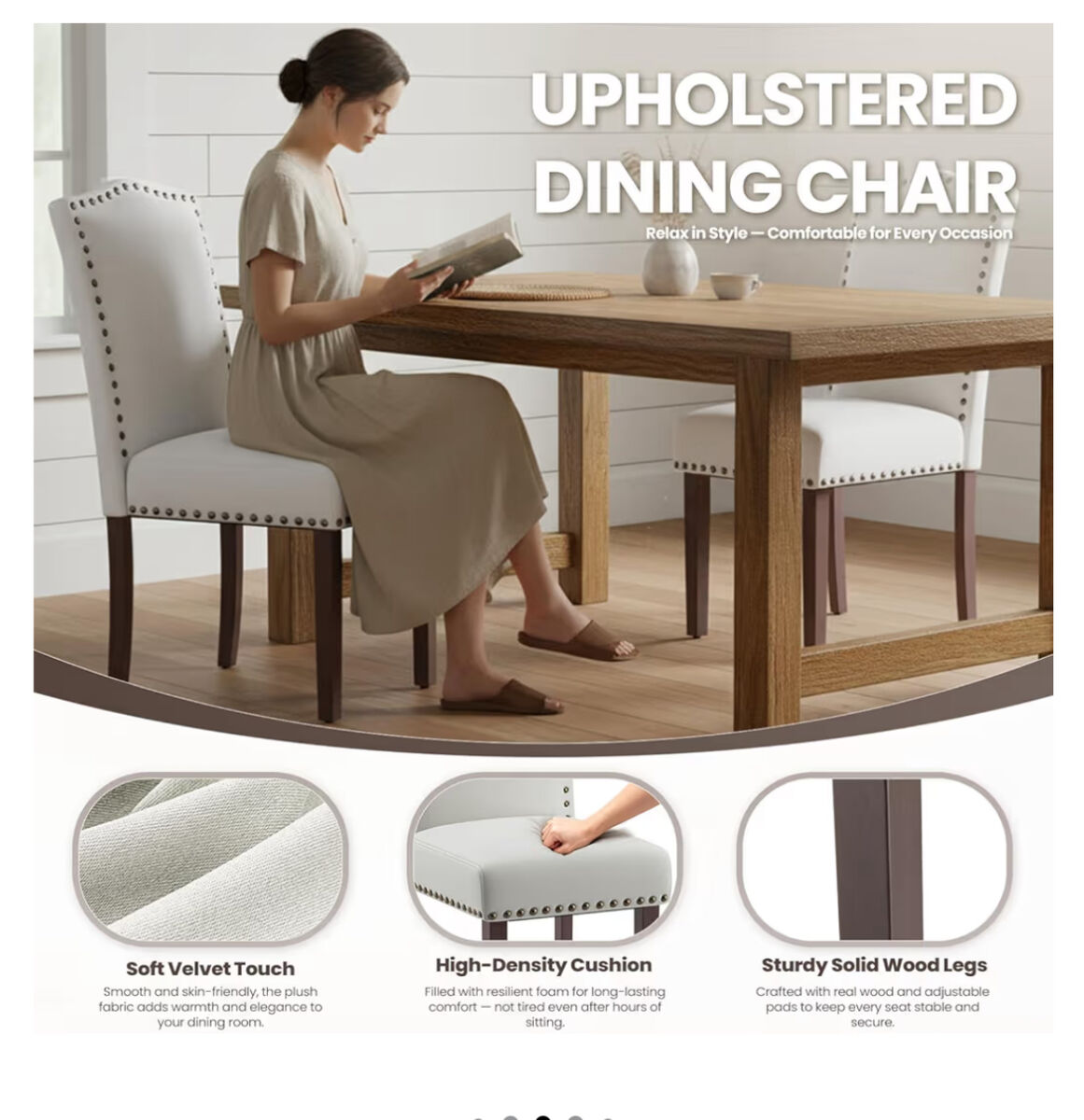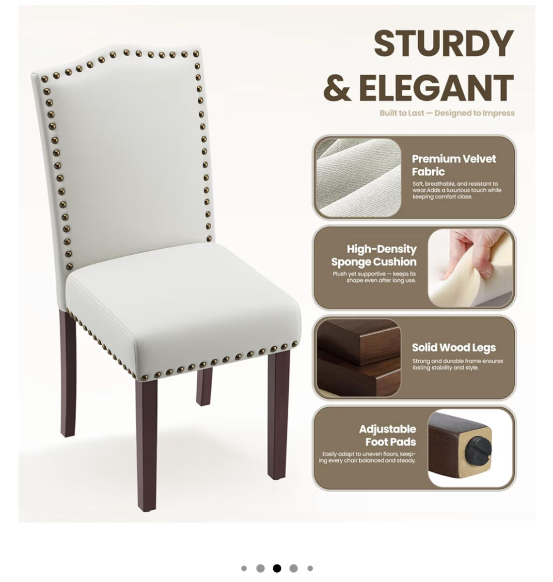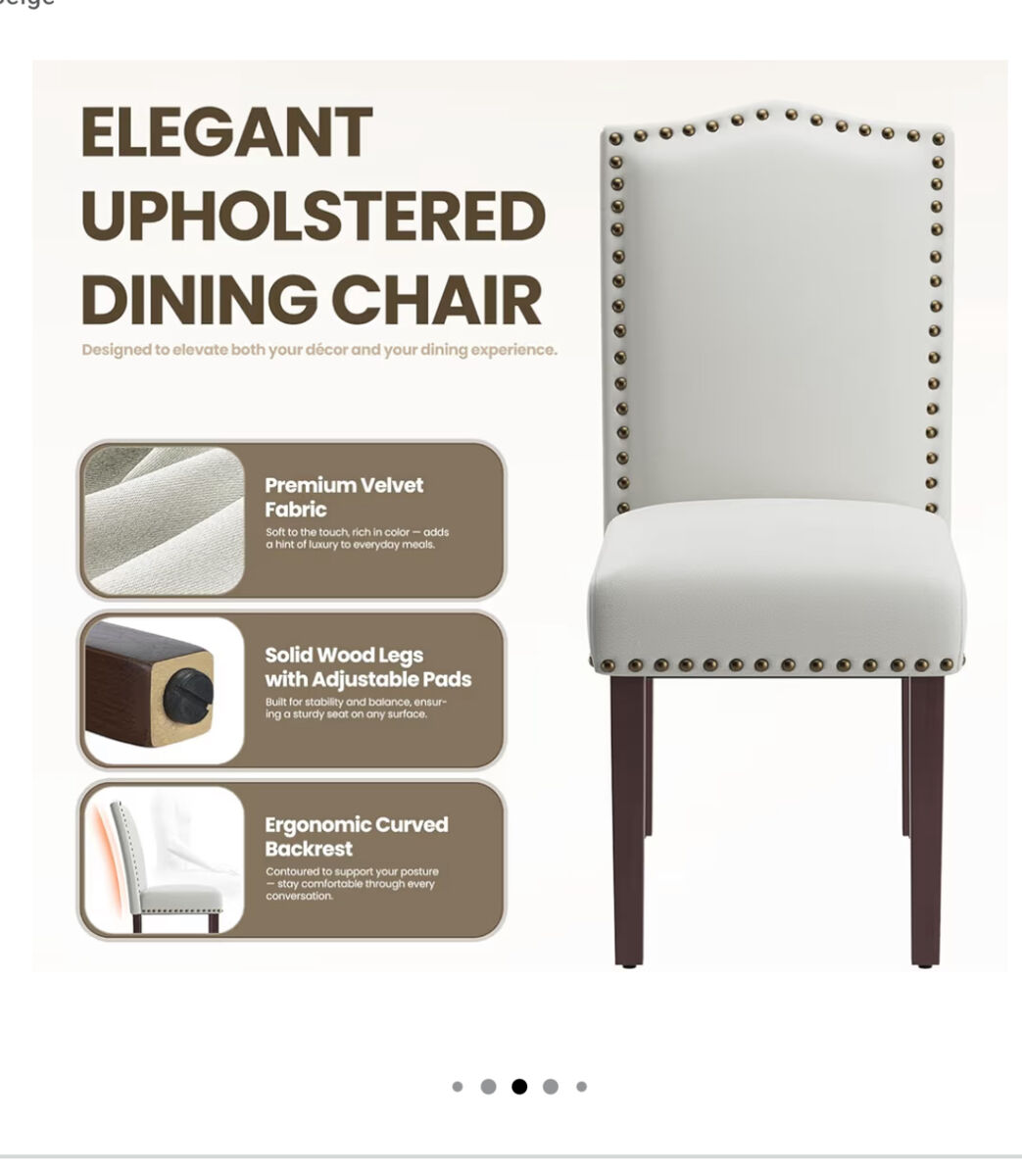X2 Quality chairs in velvety beige fabric with nailhead accent to elevate the look. Perf color to blend into existing decor.. Fabric is pre-treated for easy spot cleaning- has structural merit for a full size adult.