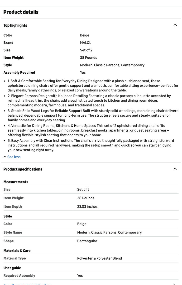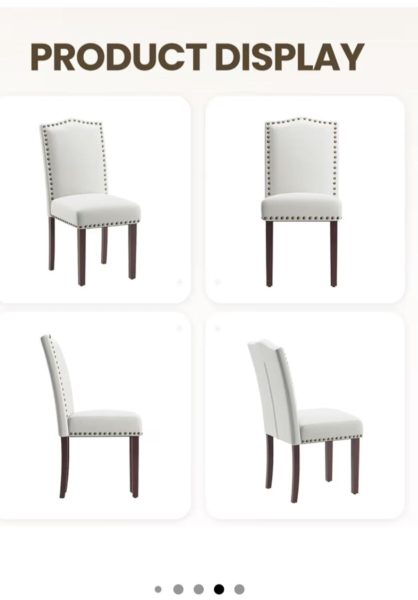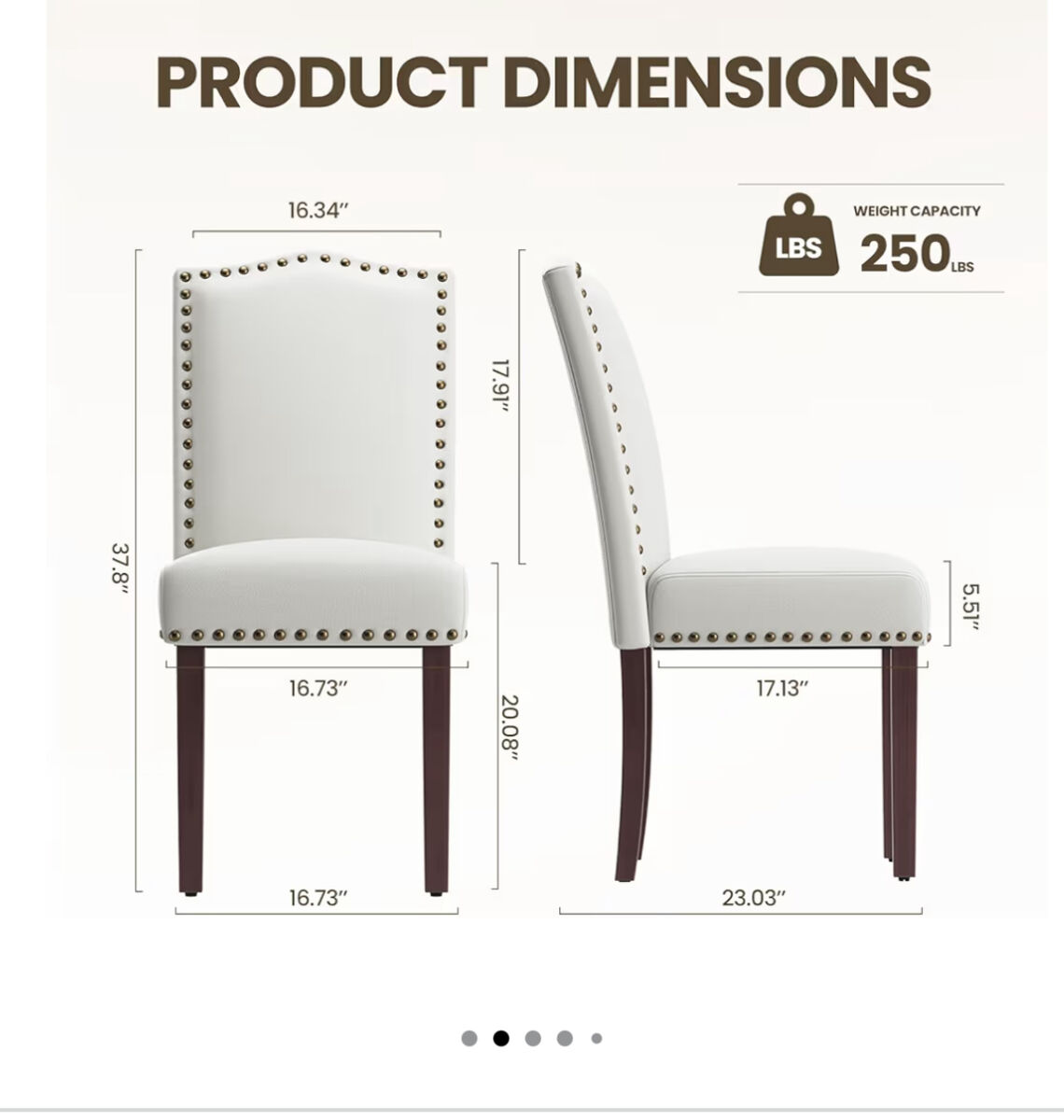 X2 Quality chairs in velvety beige fabric with nailhead accent to elevate the look. Perf color to blend into existing decor.. Fabric is pre-treated for easy spot cleaning- has structural merit for a full size adult.