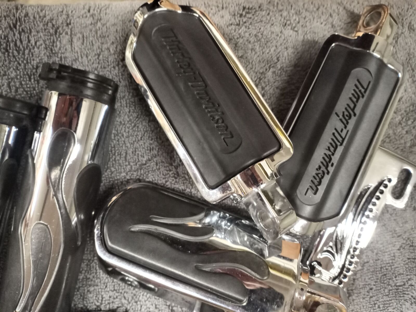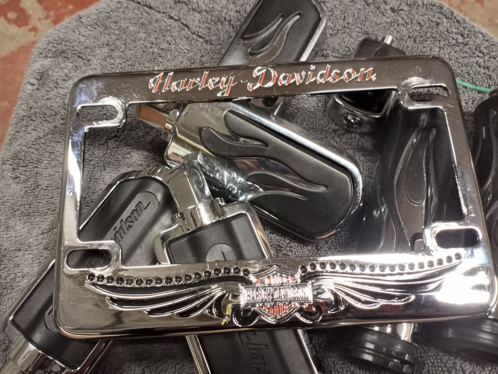 Flame grip and pegs set: two sets of pegs (both sides shown in pics), one shifter per, one set of grips that are throttle cable style. (this is not a fly-by-wire grip set) I'm throwing in a chrome H-D license plate frame as well. Take off parts that are in great condition. Fits nearly all models. Cash only.