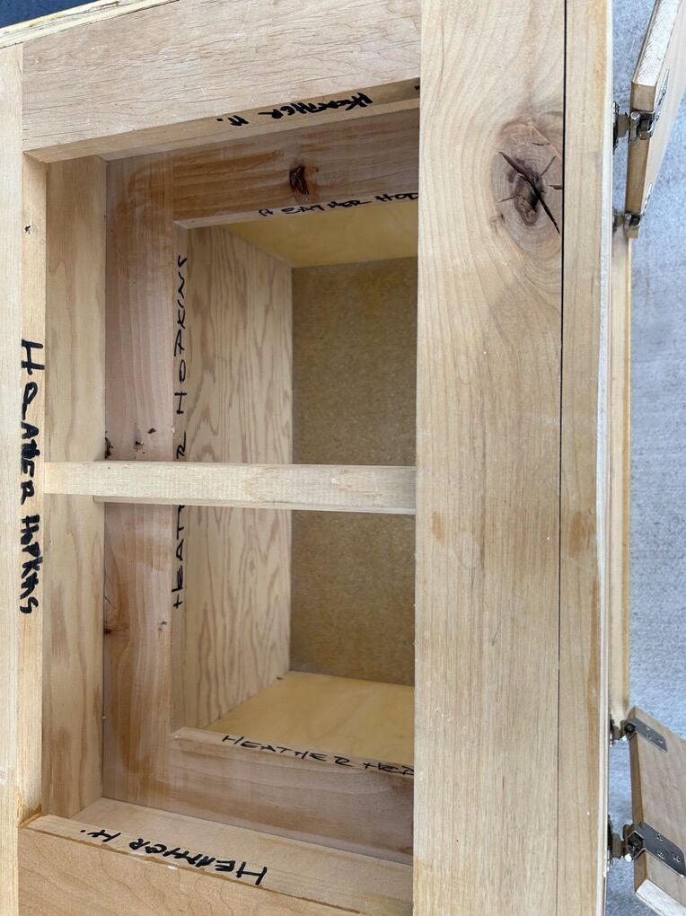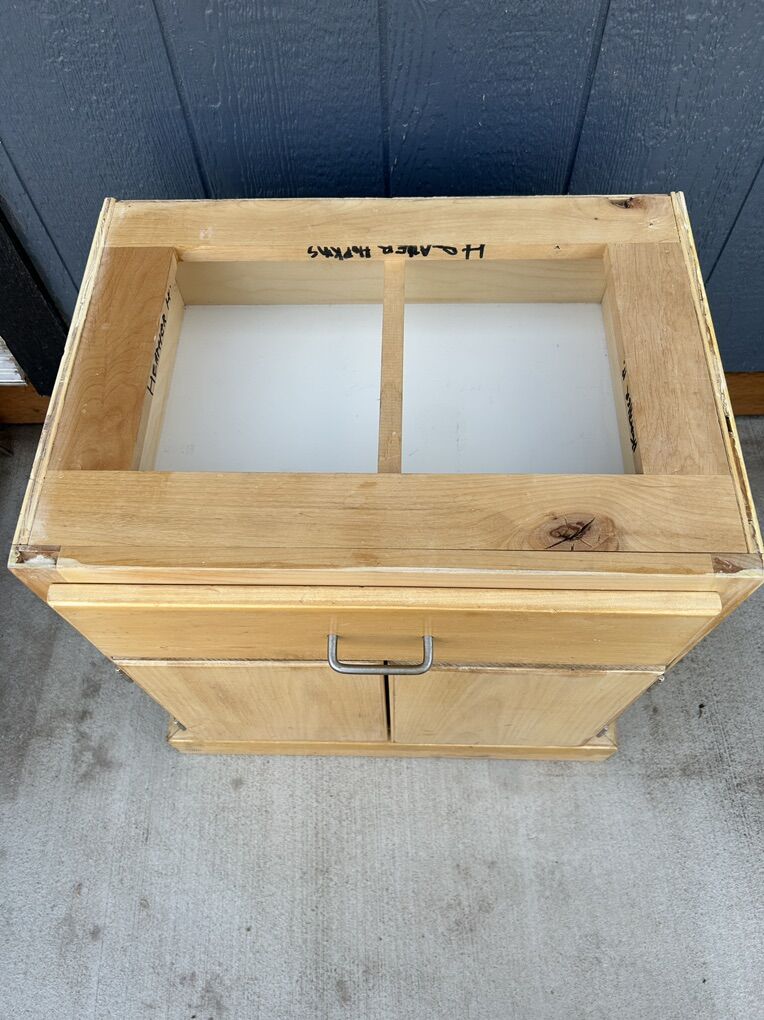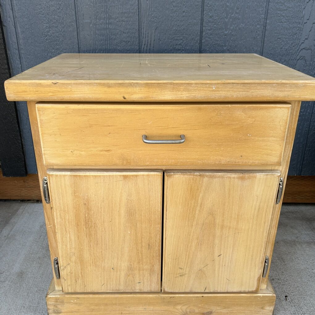 ApplePayHand crafted, One-of-a-kind End table or night stand. The top and front and sides are solid knotless hardwood- probably made by a gal named Heather because her name is on various pieces. The top is not glued on- but it is perfectly made and fits like a lid on a jar. We can glue it on for you or you or you can take advantage of it being in two pieces to refinishing it. The fact that so many parts are solid wood greatly reduces the off-gassing of formaldehyde, and other harmful off gassing of chemicals from manufactured wood and plastic. This little Blond dresser is 24 tall x 23 wide x 17 “ deep. Delivery available to a convenient location when in your area for $5.
