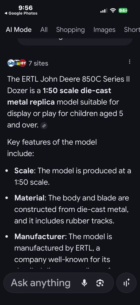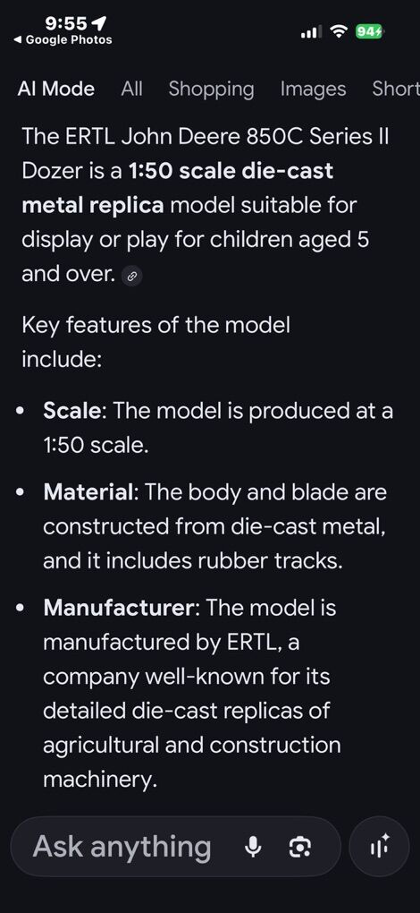 1/50 scale ERTL die cast John Deere bull dozer 850C