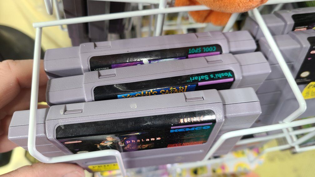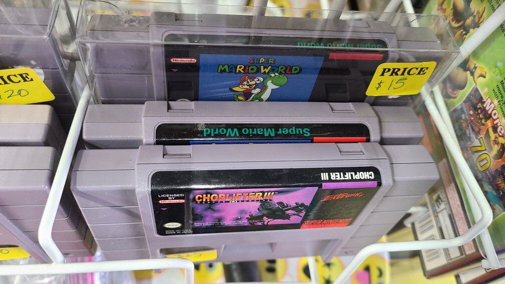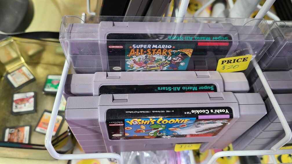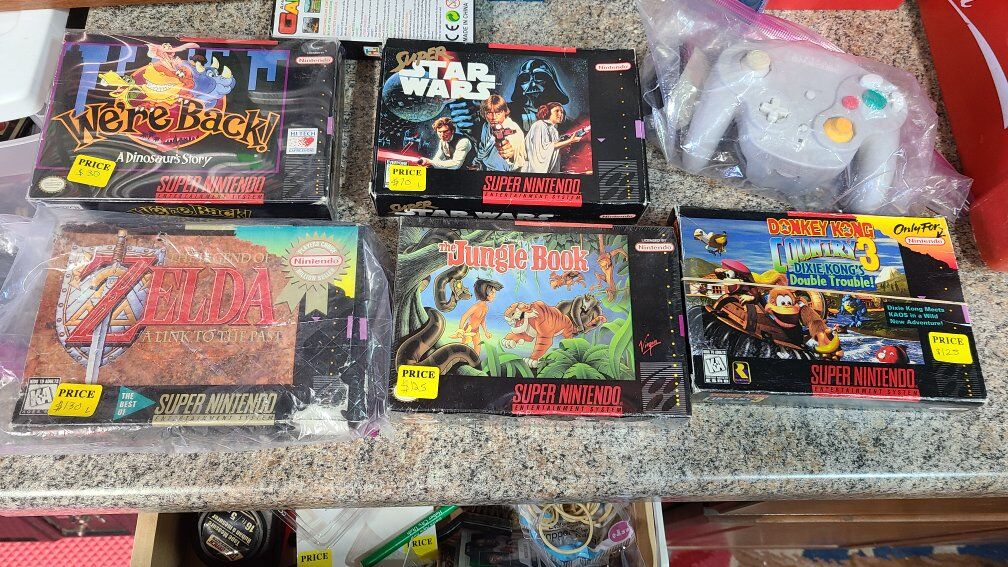 SNES games Contra 3 $40 Jurassic Park $15 phalanx $30 Yoshi's cookies $10 Choplifter 3 $25 cool spot $15 Yoshi Safari $15 Super Mario World $15 Super Mario All-Stars $20 Mario Paint with mouse $30 We're back CIB $30 H2 Superstar Wars CIB $70 H2 Legend of Zelda A Link to the Past damaged box $130 H2 Jungle Book new sealed 125 H2 Donkey Kong Country 3 CIB 125 H2 Contra 1 and 2 $60 h2
