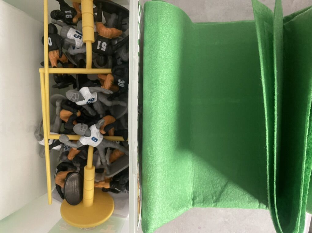 Contains 26 2” players for two full teams, one referee, two goalposts, a 32” x 20” washable felt field, an instruction booklet with football rules and strategy, and a stackable carry container with locking lid and handle.