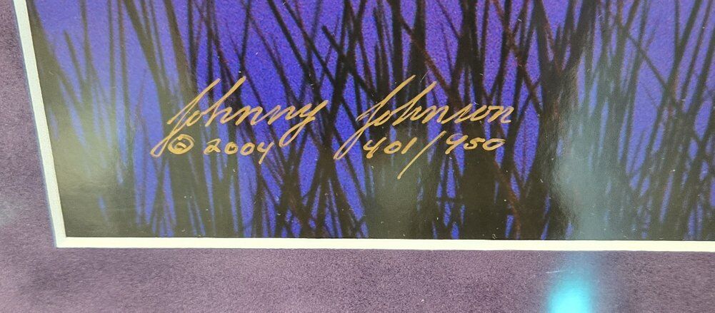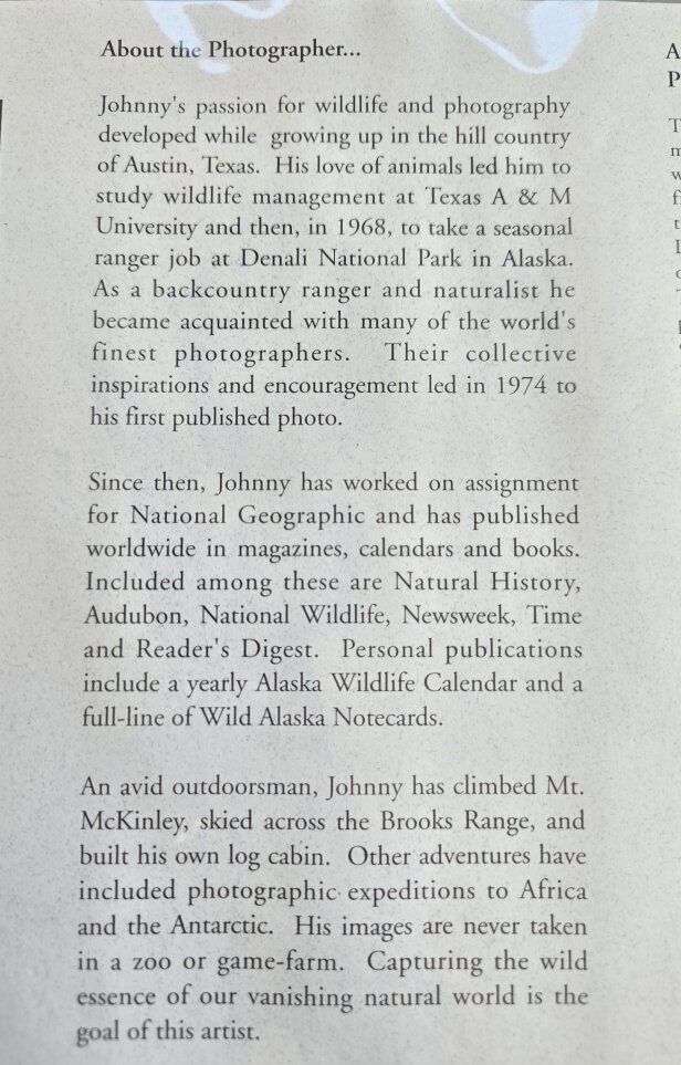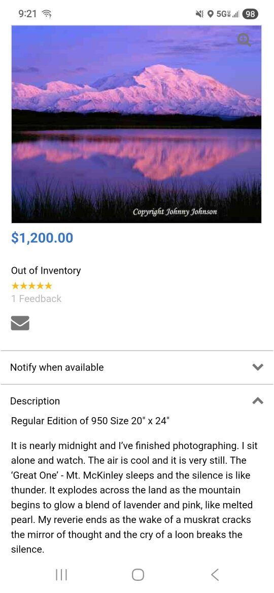VenmoExquisite photograph of Denali (Mount Mckinley), North America's highest point. Photographed by world renowned outdoor photographer, Johnny Johnson, who passed away this summer, 2025. Johnny was a contemporary and dear friend to Thomas Mangelsen, travelling together at times on photography shoots. Alaska magazine will be doing a feature article in January 2026 about Johnny. Be sure to look out for this. It will be a great addition to this photograph. You will see in the 2nd image I posted that this piece has a retail price of $1200 on Johnny's website and that this image is sold out, never to be printed again. The last few pictures I posted detail Johnny, his work and a description of Crystal Archive Supergloss Photographic images. The image size is 20x24. The piece is 35x31 including the velvet matte and frame. Johnny's website is www.johnnyjohnsonphoto.com