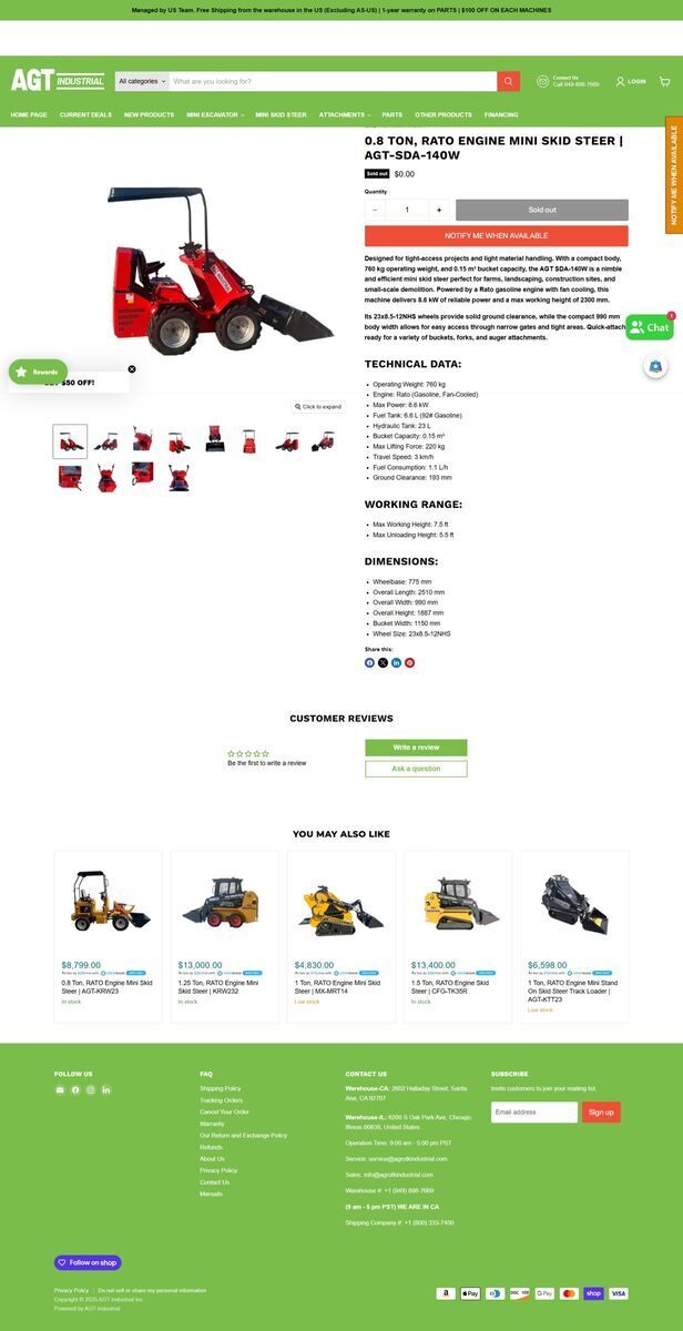 Designed for tight-access projects and light material handling. With a compact body, 760 kg operating weight, and 0.15 m3 bucket capacity, the AGT SDA-140W is a nimble and efficient mini skid steer perfect for farms, landscaping, construction sites, and small-scale demolition. Powered by a Rato gasoline engine with fan cooling, this machine delivers 8.6 kW of reliable power and a max working height of 2300 mm. Its 23x8.5-12NHS wheels provide solid ground clearance, while the compact 990 mm body width allows for easy access through narrow gates and tight areas. Quick-attach ready for a variety of buckets, forks, and auger attachments.