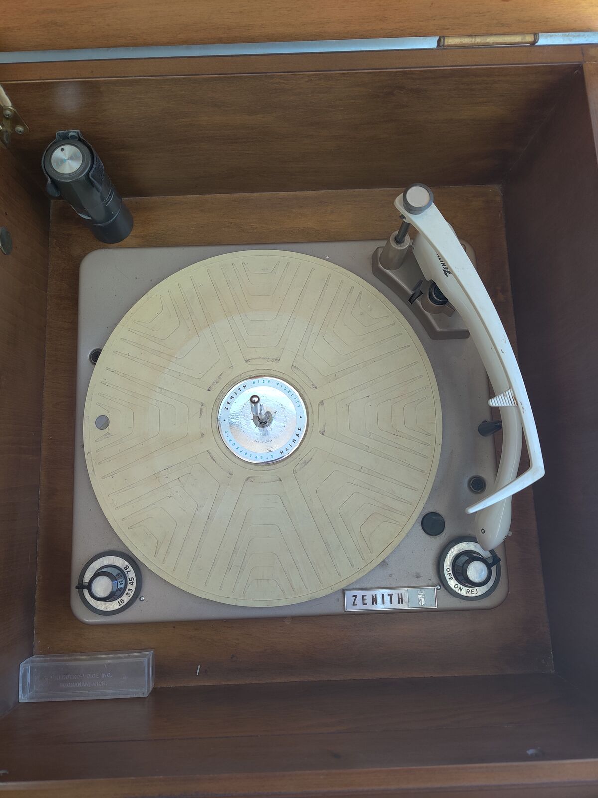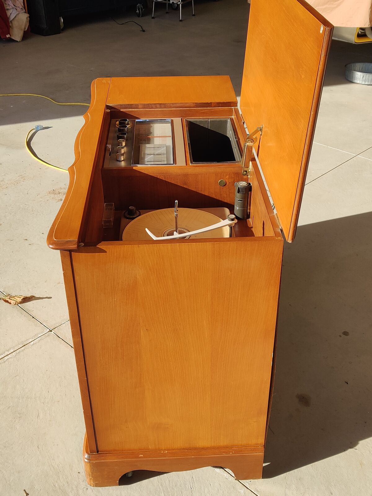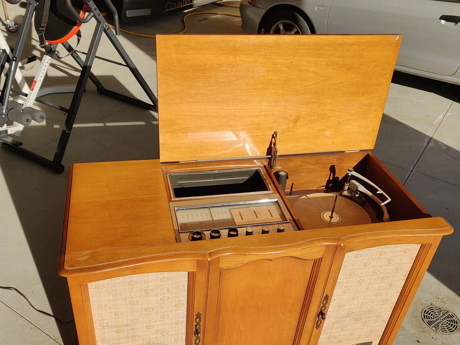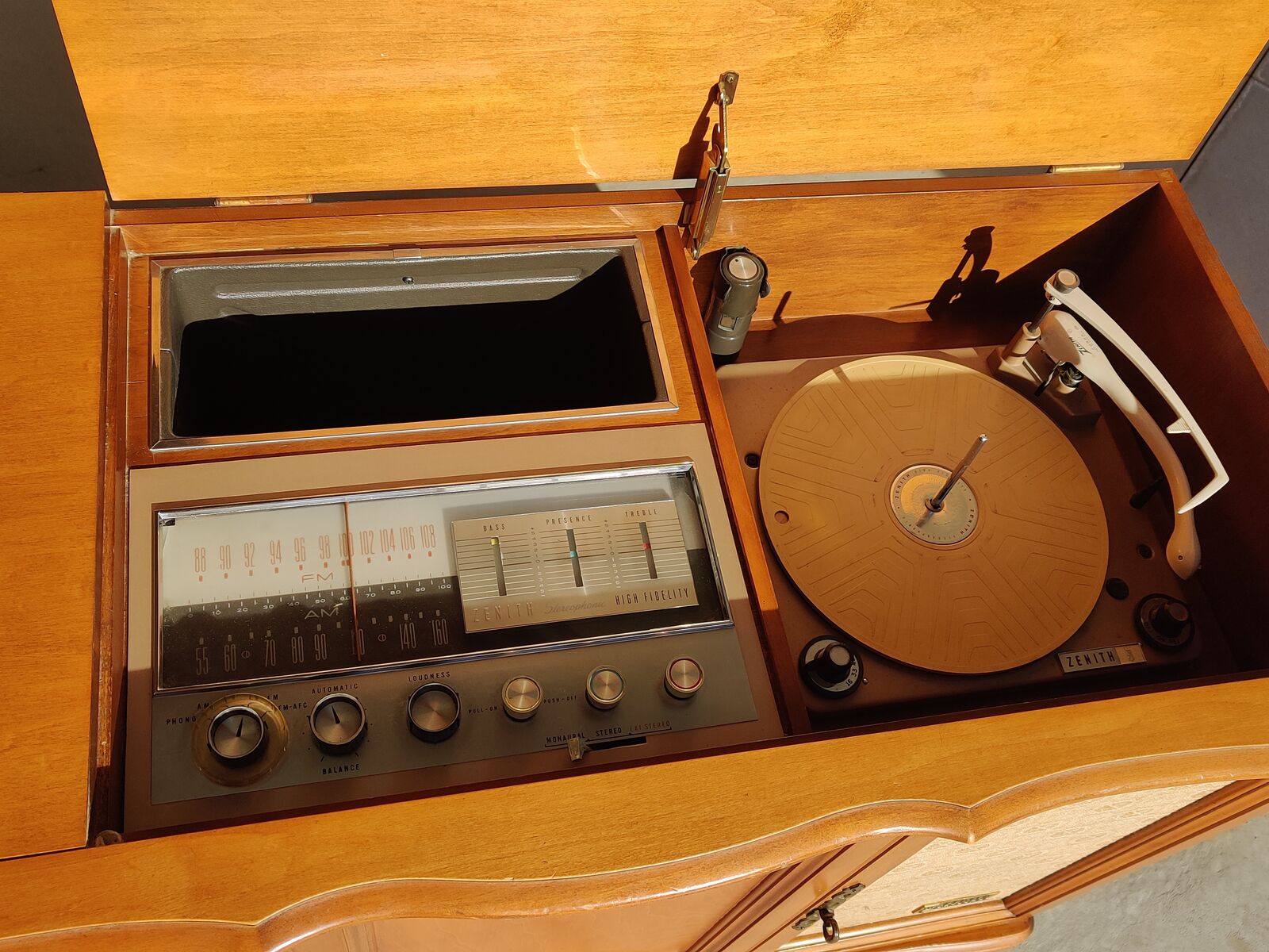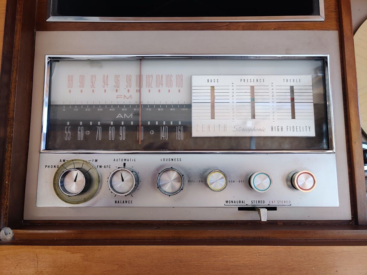 ZelleZenith Extended Stereophonic High Fidelity console stereo mid 1960s, with built-in turntable and AM/FM radio. Excellent cosmetic condition, Fully working Zenith brand one of the most desirable U.S. console makers. Mid-century cabinet size (20 × 45 × 32) Mid-century modern hi-fi” Fully working turntable and radio. Needs $10 needle you can buy on amazon. Excellent original condition All functions tested Original cloth intact. No major scratches or water damage $350 OBO