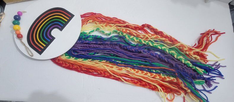 $5 each. Pillow is double sided. Wall hanging is painted and yarn tasseling.
