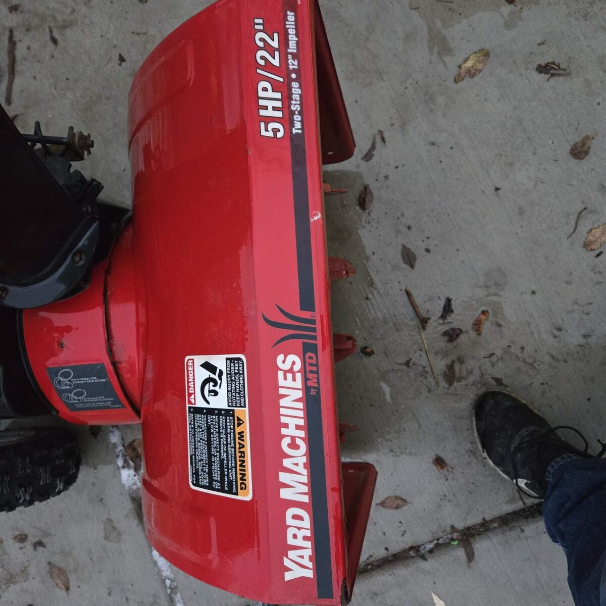 VenmoYard Machine snow blower for sale. 5 HP, 22". Made by MTD. 5 forward, 2 reverse. 2 stage. 12" impeller, new drive cable. Skids at good and it runs good. $300/OBO. Call or text John 435-850-2909. Cash or Venmo only. No codes/No scams.