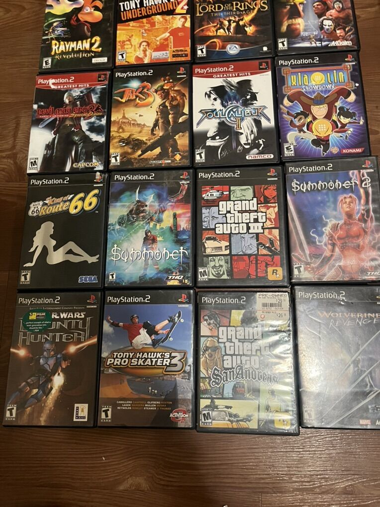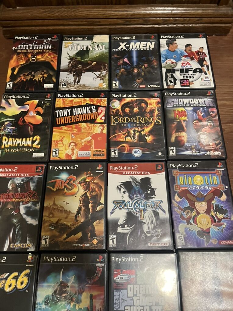 PLAYSTATION 2 PS2 Games . Price is for each. Games are Batman rise of Sin tzu , Conflict Vietnam X-Men next dimension FIFA 2005 Rayman 2 Tony Hawk underground 2 Lord of the rings showdown legends of wrestling devil may cry 3 Jack 3 soul caliber 2 Xiaolin showdown King of Route 66 summoner GTA 3 summoner 2 Star Wars bounty hunter, Tony Hawk pro skater 3 GTA San Andreas Wolverines revenge