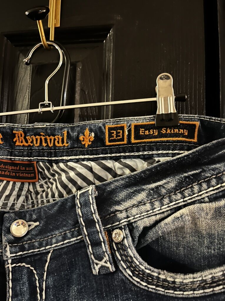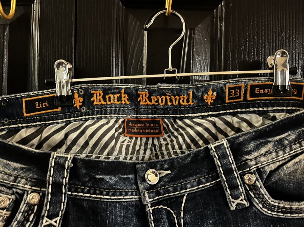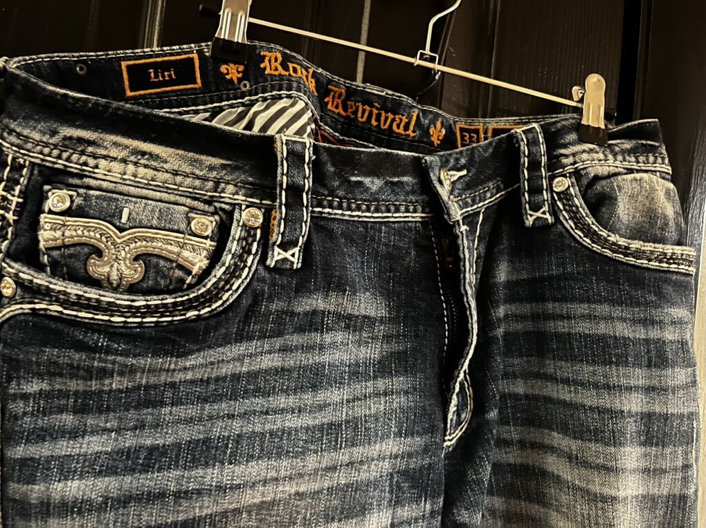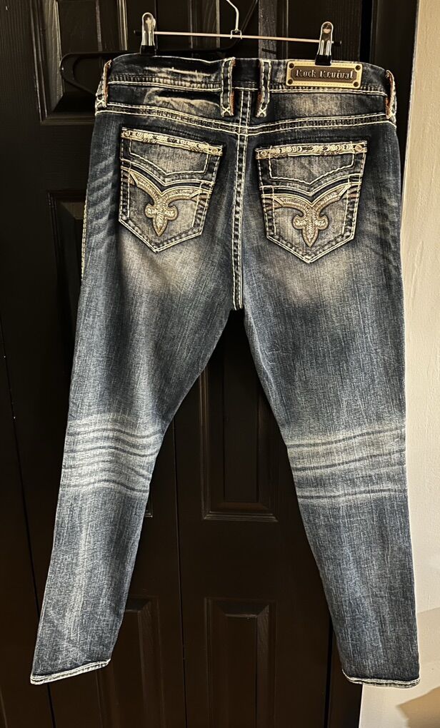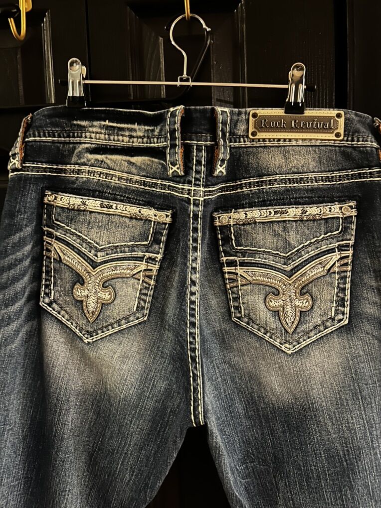 VenmoWomen’s rock revival liri straight leg jeans in blue wash with white sticking. These are in excellent condition. Size 33 easy skinny