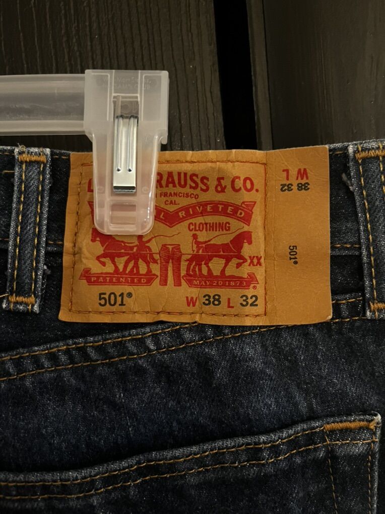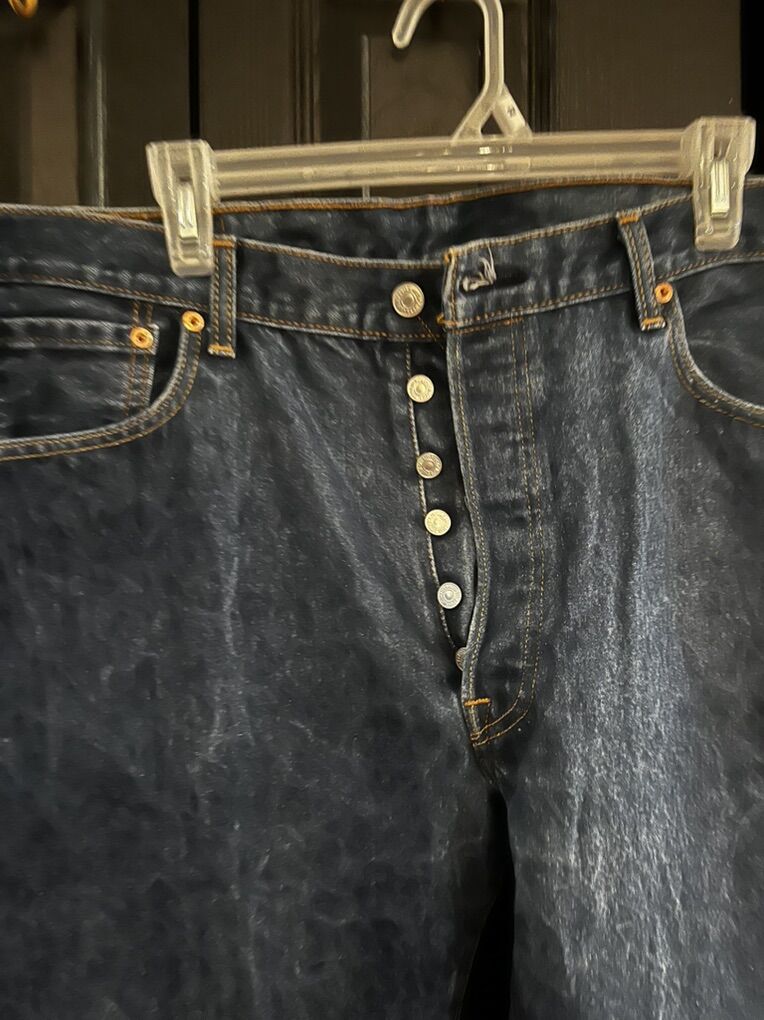 VenmoIn really good condition Levi’s 501 with button fly and a faded dark blue. Size is W38. L32
