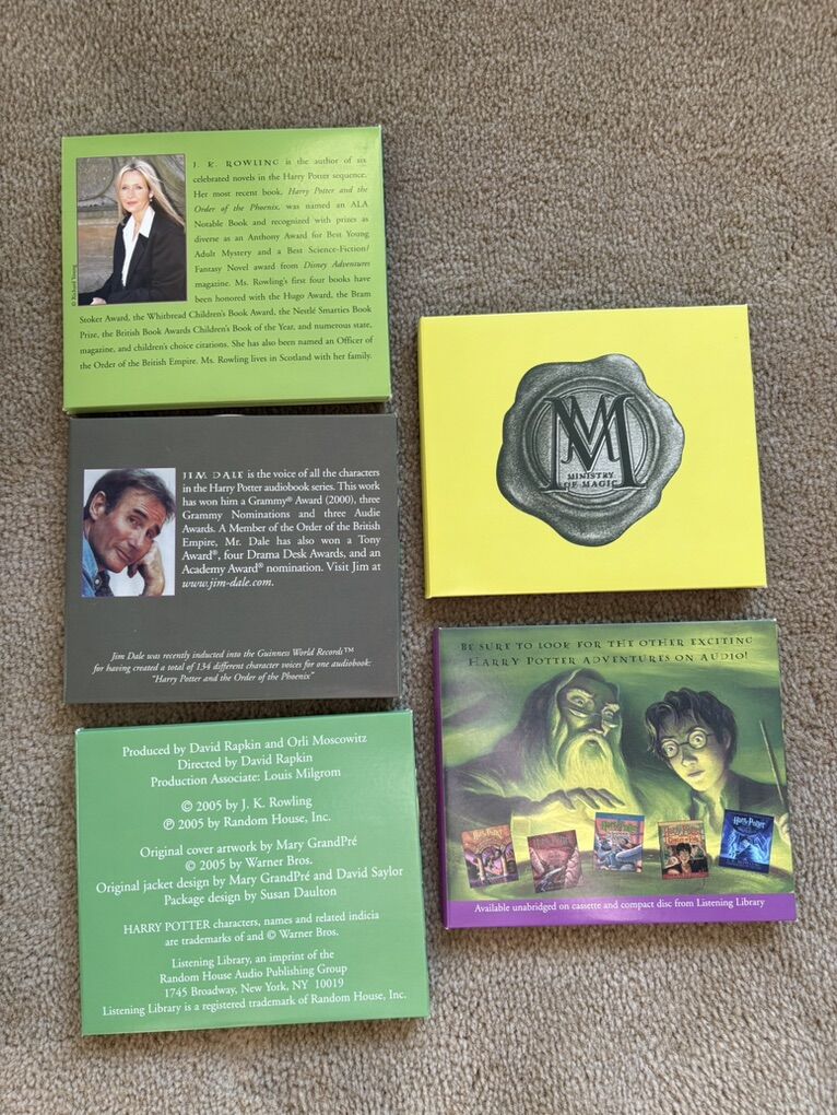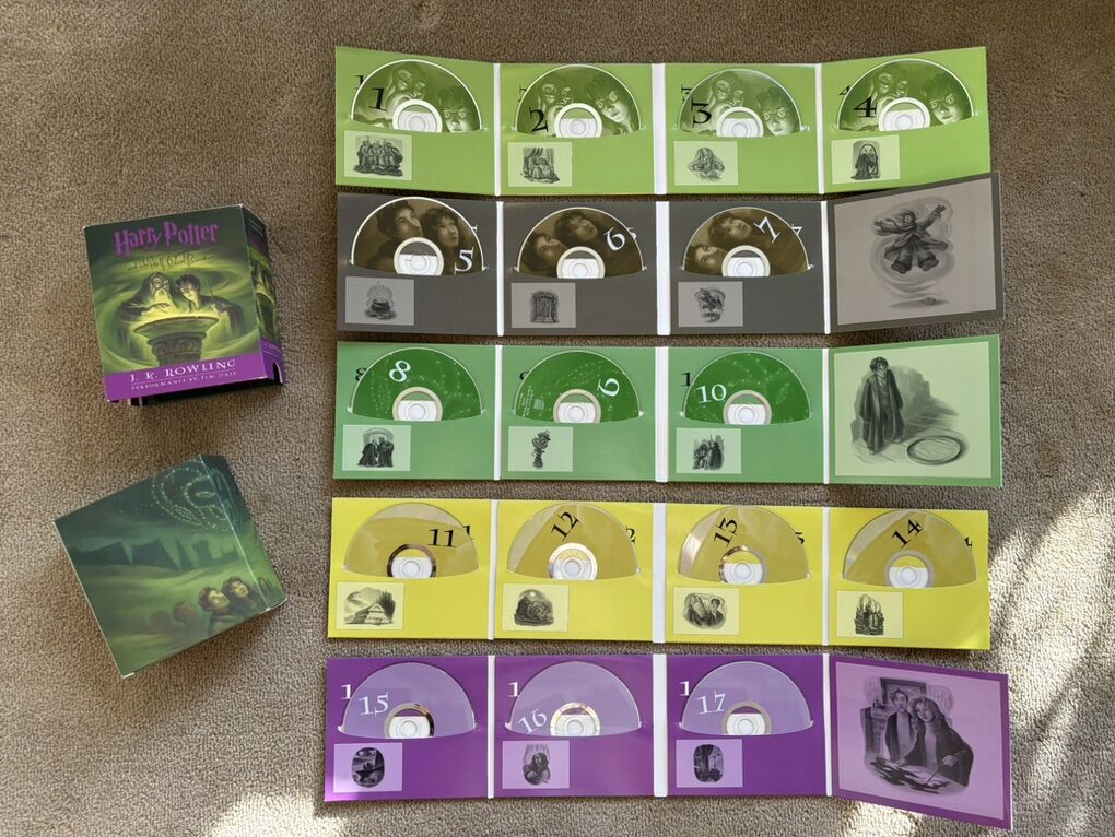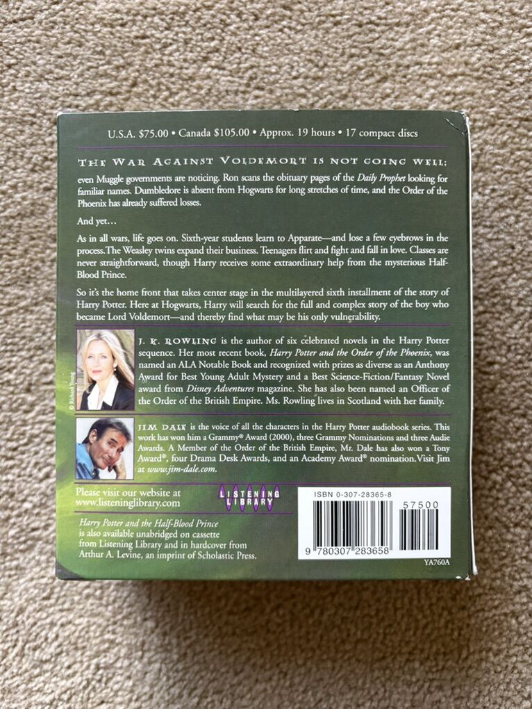 Harry Potter and the Half-Blood Prince Audiobook, by J. K. Rowling. 6th book in the series. Unabridged on 17 compact discs, approx. 19 hours. Performance by Jim Dale. Excellent condition. Text only. Cash or Venmo.