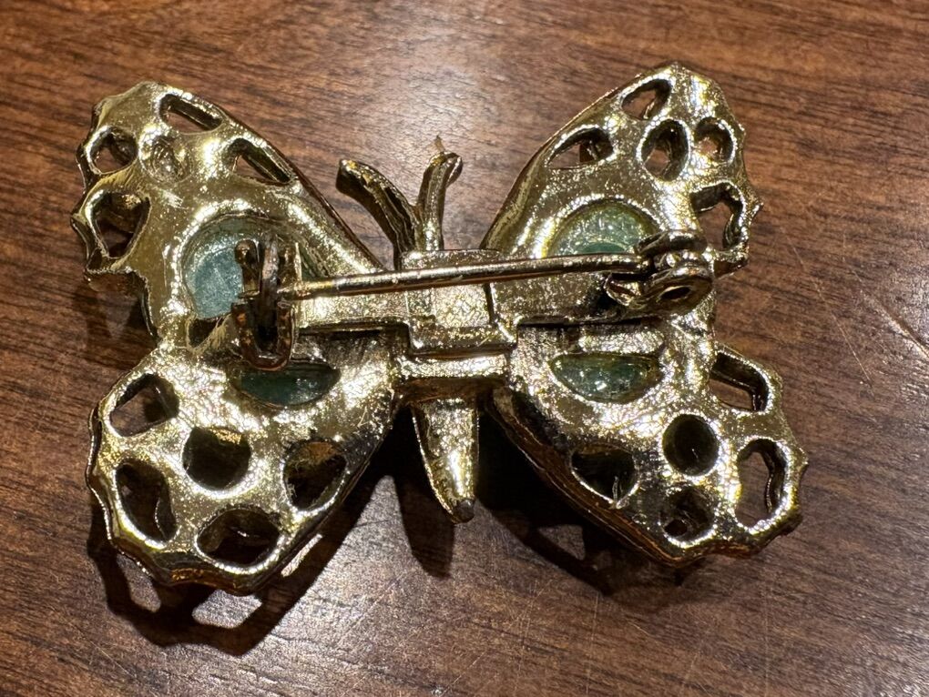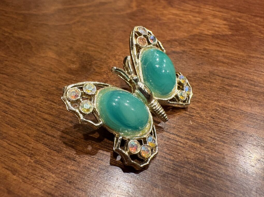 I have a beautiful vintage butterfly brooch. It is gold tone with 2 green Jelly Belly stones and 12 aurora borealis rhinestones. I don’t see any maker’s marks or metal content markings. It is 1 3/8 inches across. I believe it’s from the 1940s or 50s. See my other ads for jewelry, artwork, home decor and more.