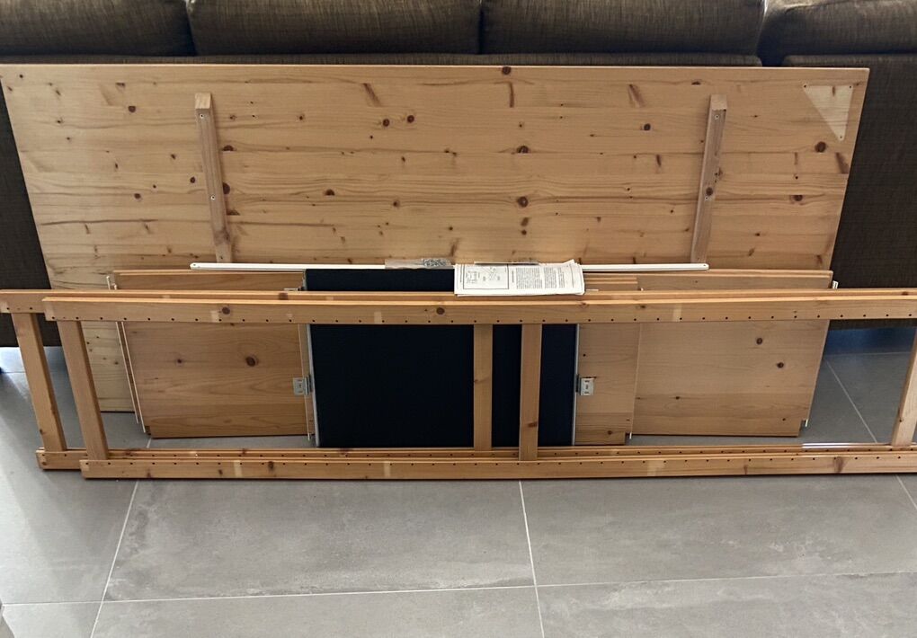 VenmoThis was purchased several years ago at the container store. It is Scandinavian design well made minimalist desk and shelving. It was made in the Netherlands. Solid pine wood and still in great shape. It has a pull out keyboard shelf that can be attached. Desk top size is 72”x 30”. The shelving unit stands 82” high and each shelf is 30”x15”. There are 6 shelves. The picture attached is similar to what it will look like put together but it is not the exact desk. This desk has been in storage and I don’t have a picture of it put together. Please contact me with questions.