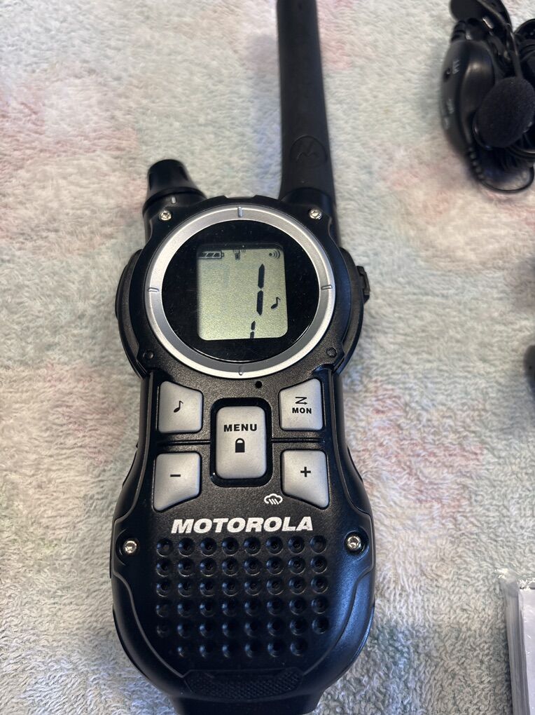 VenmoMotorola, MR351R, black, FRS/GMRS, earbuds with push to talk microphone, belt clip, user manual. PTT power boost, NOAA WEather radio, emergency alert button, hands free operation, scan, interference eliminator, vibrancy alert, quiet talk, 20 call tones, talk confirmation tone, battery meter. Up to 35 mile range. 3 AA alkaline or rechargeable batteries