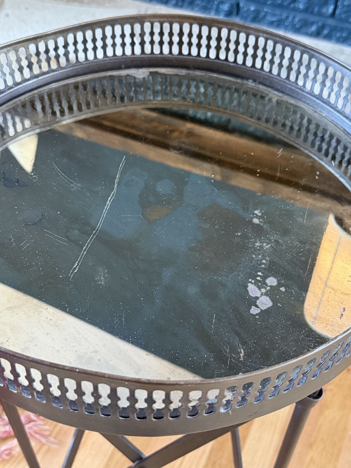 VenmoBought locally from importer CG Sparks. Industrial modern side table with antiqued mirrored-top (scratched, as shown in photos).