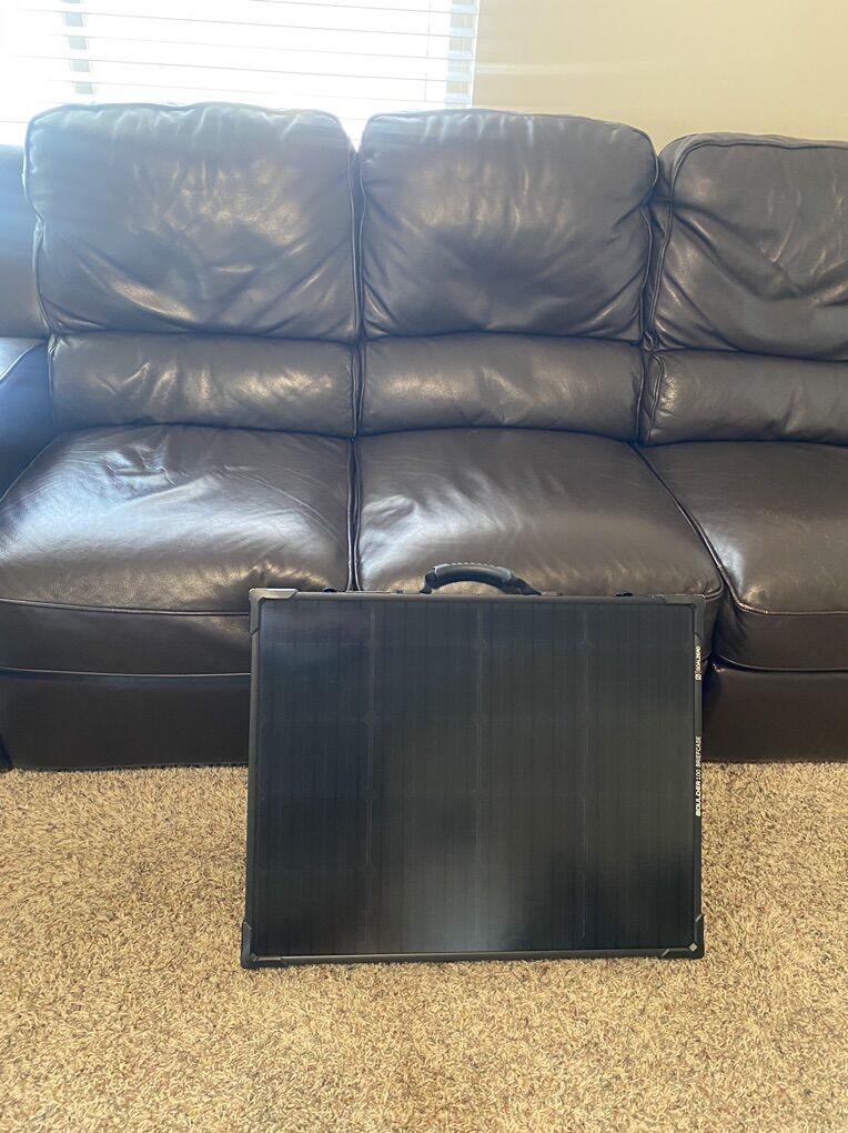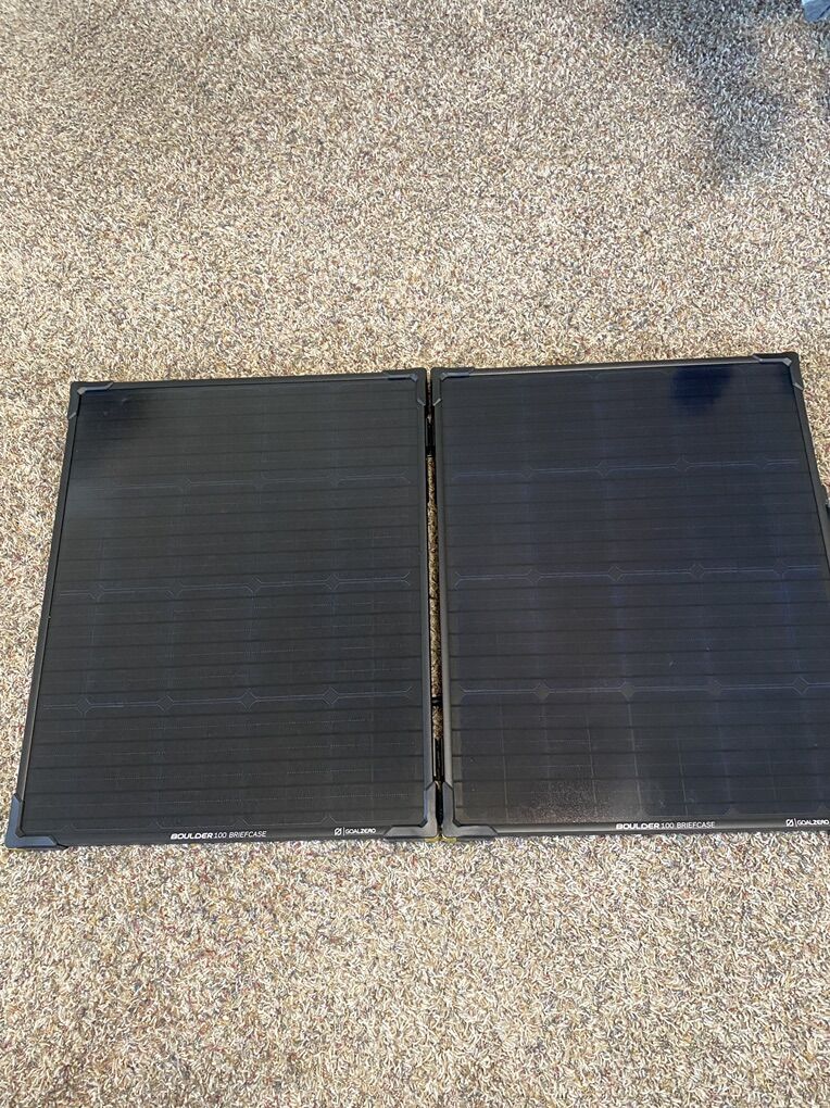 Portable 100-watt folding solar panel by Goal Zero. Briefcase-style design with built-in kickstand for easy setup. Works great for camping, RVs, off-grid power, or charging Goal Zero Yeti power stations.