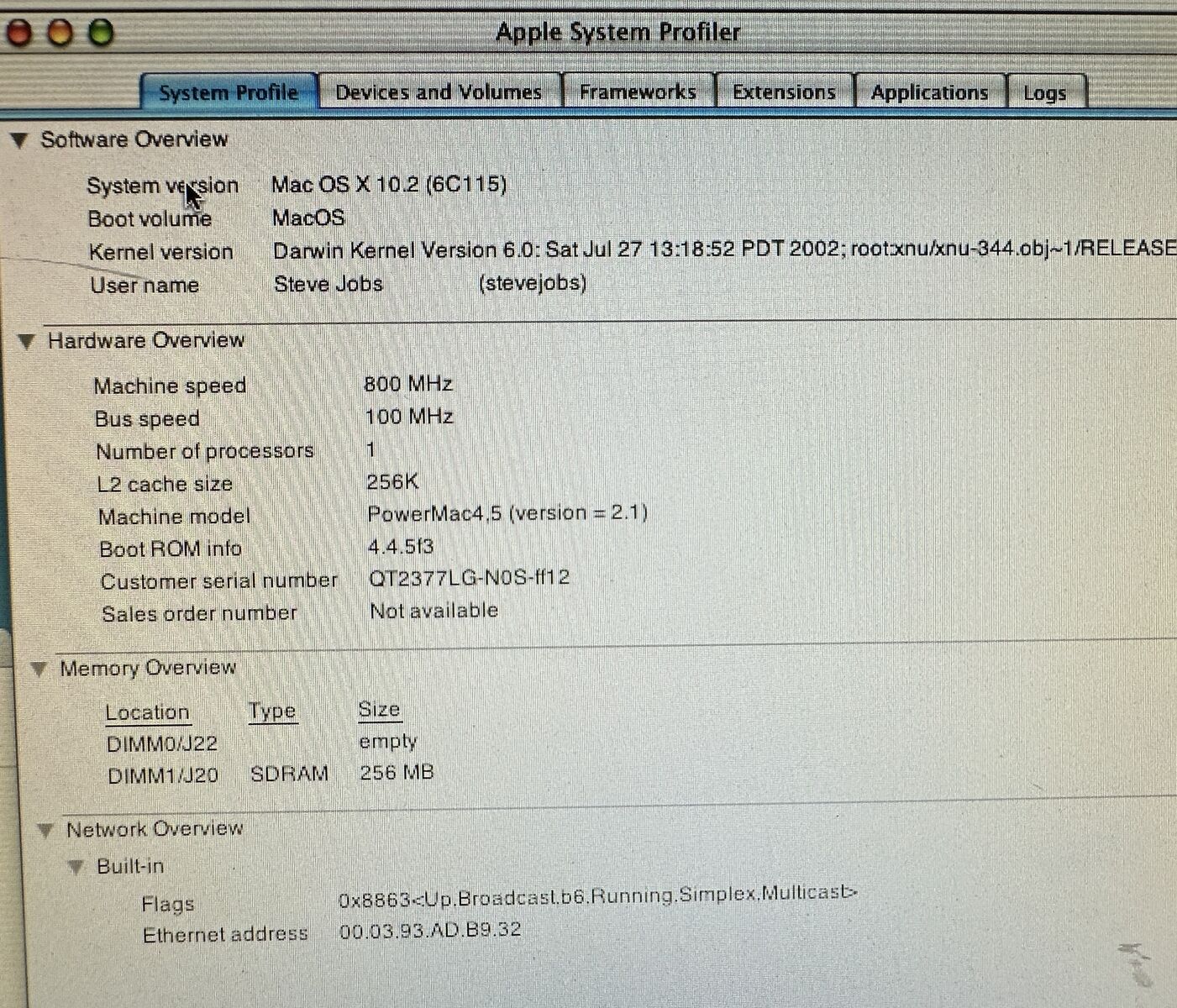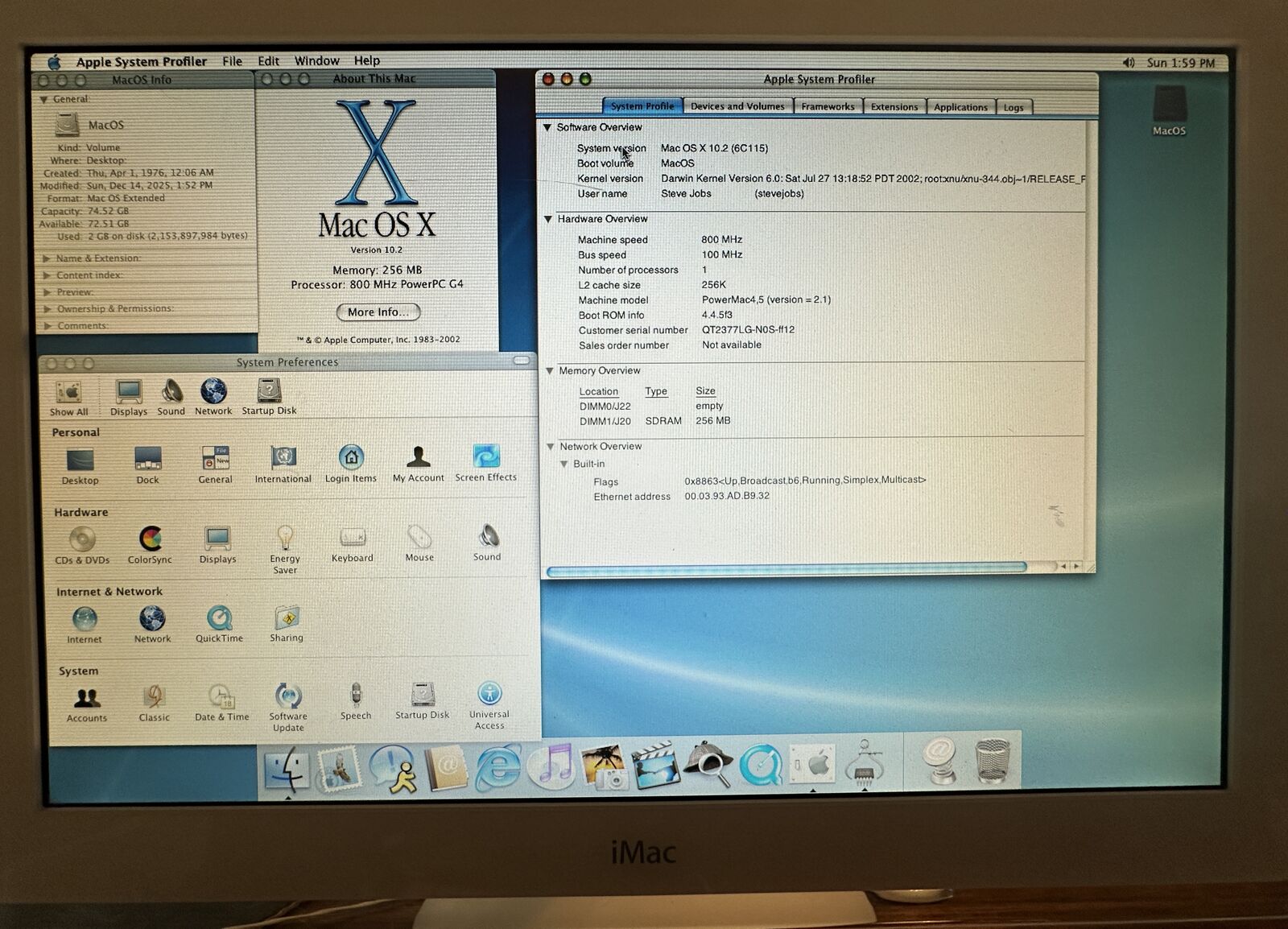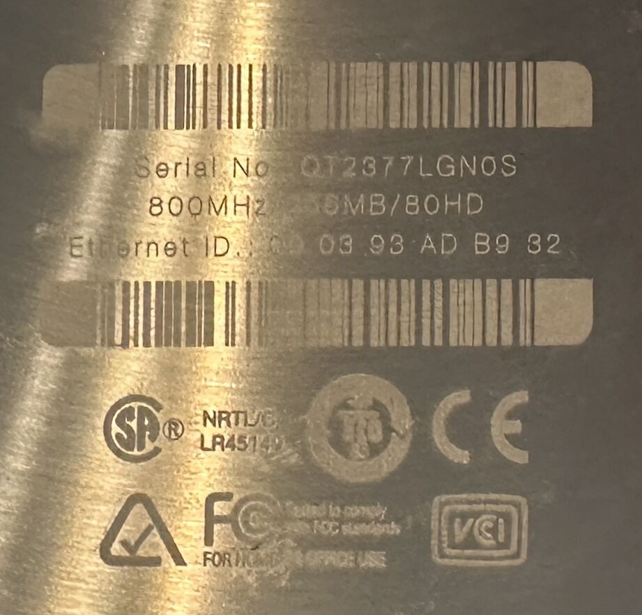 Good condition. Fresh installation of OS X 10.2 and ready to go. There are two minor scratches on the screen (see picts). Just the plastic on the front, not the LCD.