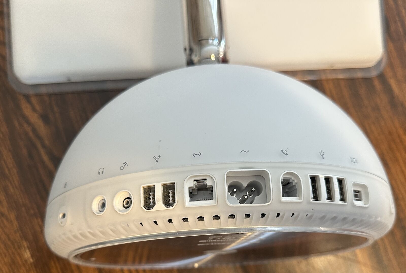 The internal components are housed in an attractive 10.6" half-sphere, ice white case with a chromed stainless steel neck that supports a 17" TFT Active Matrix LCD display. This system has three USB 1.1 ports (shared on two 12-Mbps controllers) and two Firewire "400" ports (eight watts shared).