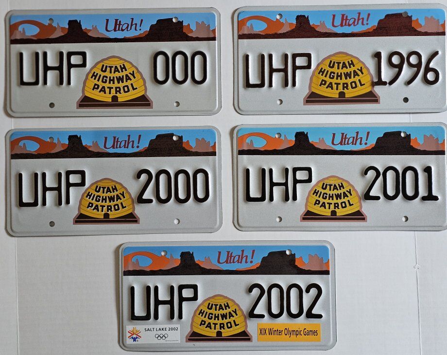 Utah Highway Patrol license plates that were made as commemorative plates and sold through the UHP Quartermaster Department from about 1996 through the Winter Olympics of 2002. Also included is a UHP Sample Plate marked 000. All are in like new condition. I believe that this collection is all inclusive of the commemorative plates. This offering is an all-time low price of $300 OBO for all 5 plates. Perfect Christmas gift for your Trooper or license plate collector. Call or Text Ted @ 801-678-2287.