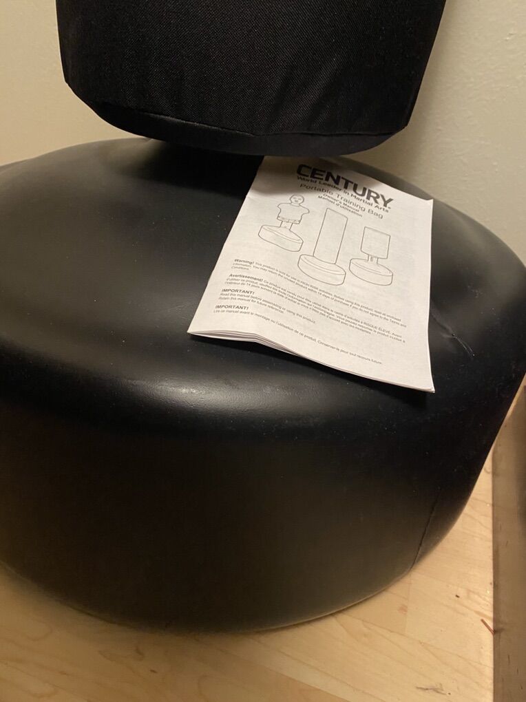 Century Original Wave Master Cardio free standing training bag. 8 height adjustments from 47” to 68”. Base approximately 270lbs when filled. Round base designed for easy roll location. Unfilled weights approximately 30lbs. Overall dimensions 48” H x 24” W x 24” D. Like new condition. Includes Purple Premier 12oz boxing gloves and sparing gloves- size Small. $75