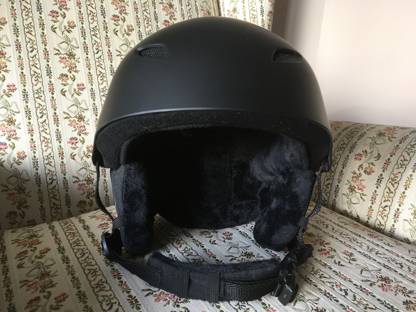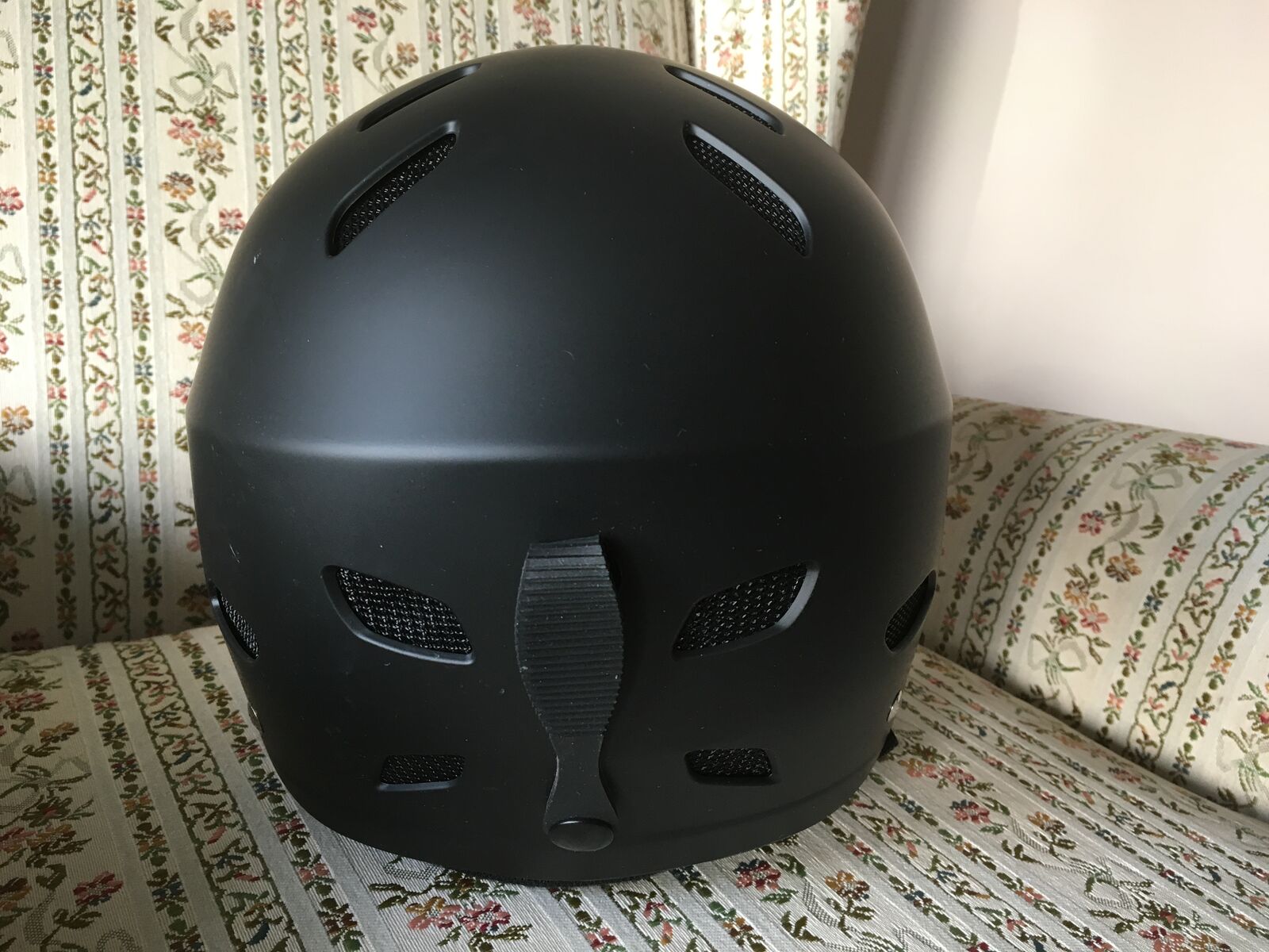 For sale is a virtually brand new Outdoor Master Kelvin ski helmet, size XL. It has been worn only one day and is in brand new condition. The label says 60 - 63 cm, 600 grams. The helmet is black, has a band that snaps into place to hold one’s goggle strap in place, and has an adjustable chin strap. $35
