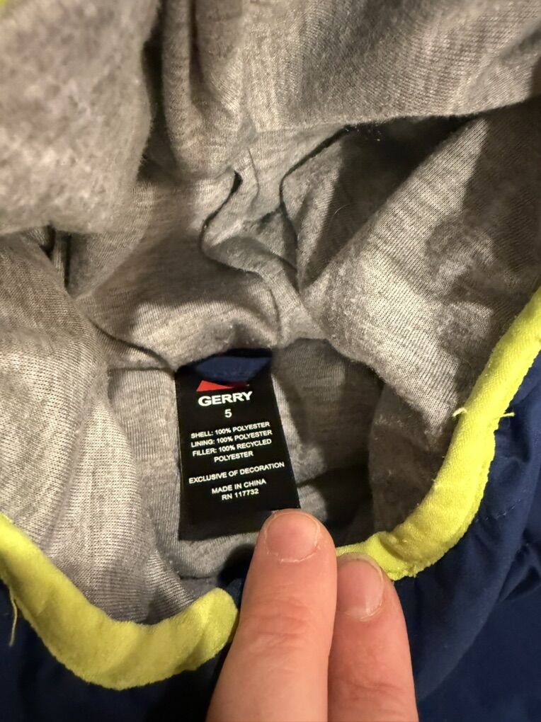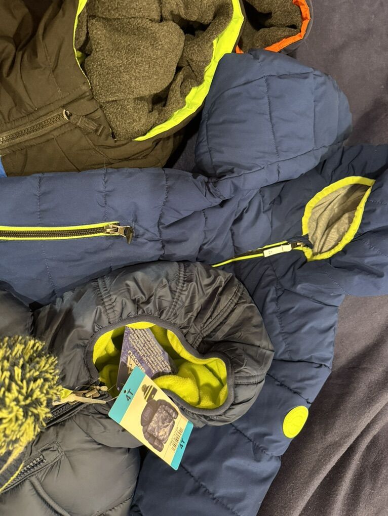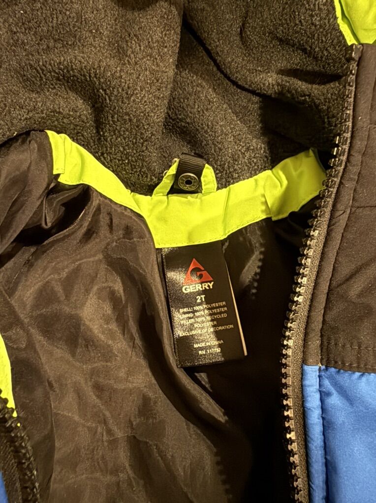VenmoGreat condition toddler coats No holes or stains 2T- Gerry- blue black and neon green trim- lightly used-$5 3T- Gerry- blue, black with orange trim- lightly used- $5 (SOLD) 4T- Snozu- brand new- with toboggan- navy blue, neon green- also has fleece jacket inside- removable- multiple jacket options. -$10 (SOLD) size 5- Gerry- Navy with neon trim - lightly used- $5