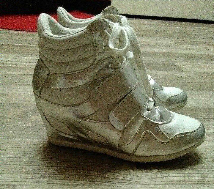 Brand new. Silver & white super cute high top shoes. Womens size 9.
