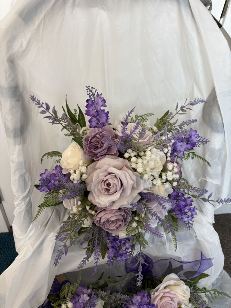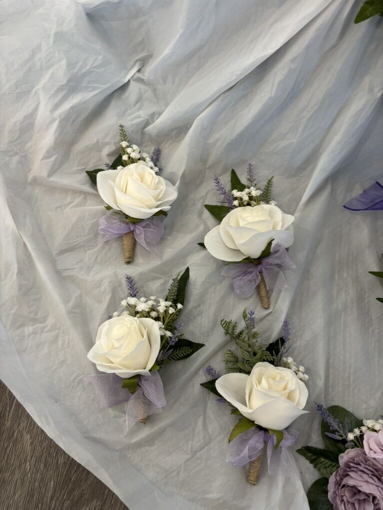 VenmoSold as a set. Set is crafted with artificial flowers and greenery. Set includes: 1 bridal bouquet 1 grooms bout 5 bridesmaids bouquets 5 groomsmen’s bouts 2 mother’s wrists corsages 2 father’s bouts There are coordinating arch flowers and isle markers in a separate listing.