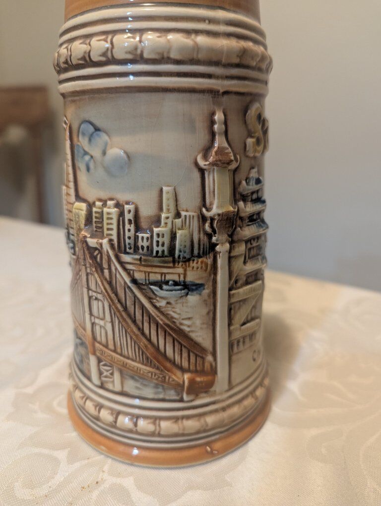 VenmoClassic vintage ceramic beer stein featuring San Francisco landmarks, including Chinatown and the iconic Cable Car. Heavy, well-made stein with raised lettering and detailed artwork. Great display piece for collectors, beer stein enthusiasts, or San Francisco memorabilia fans. Perfect for display, gift, or adding to a collection.