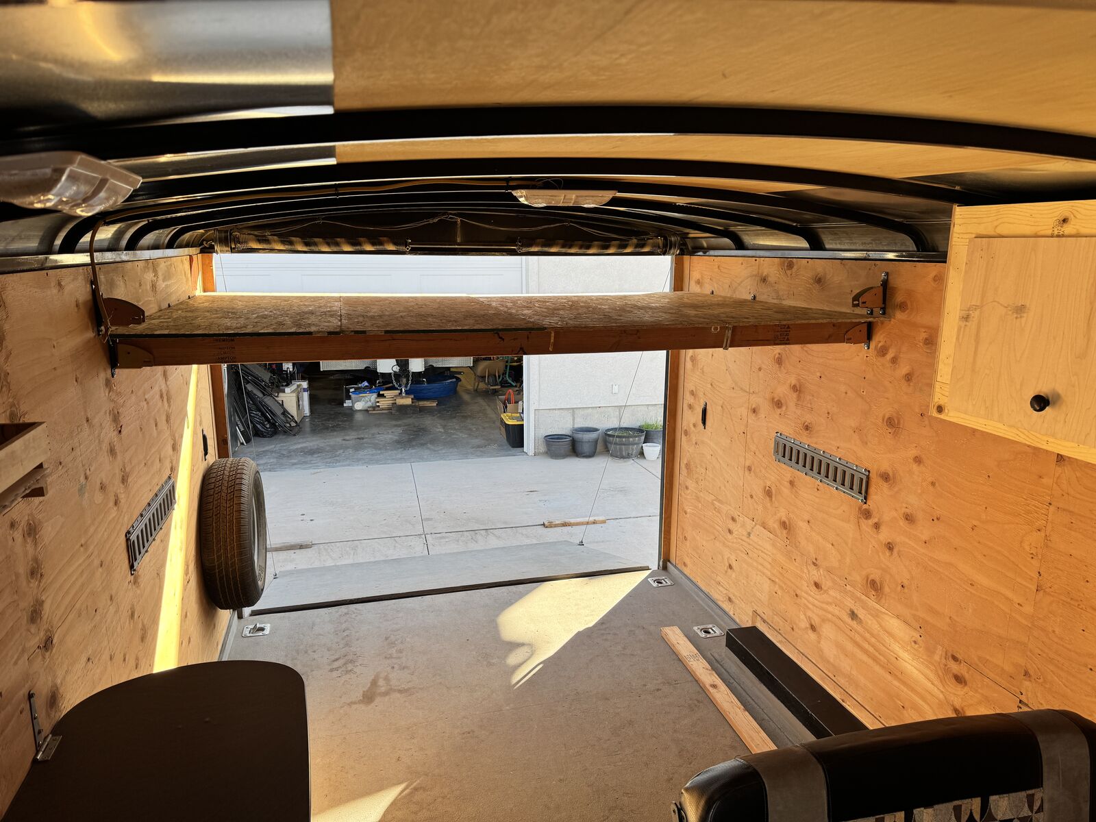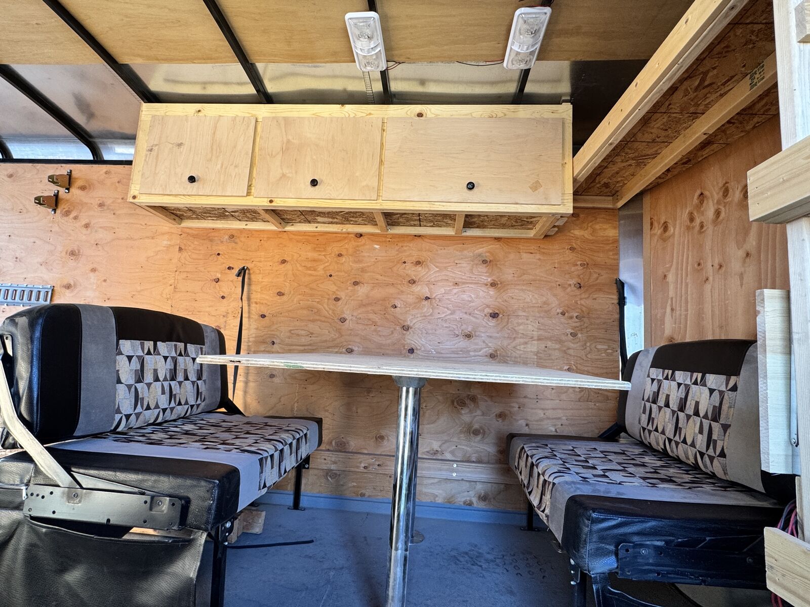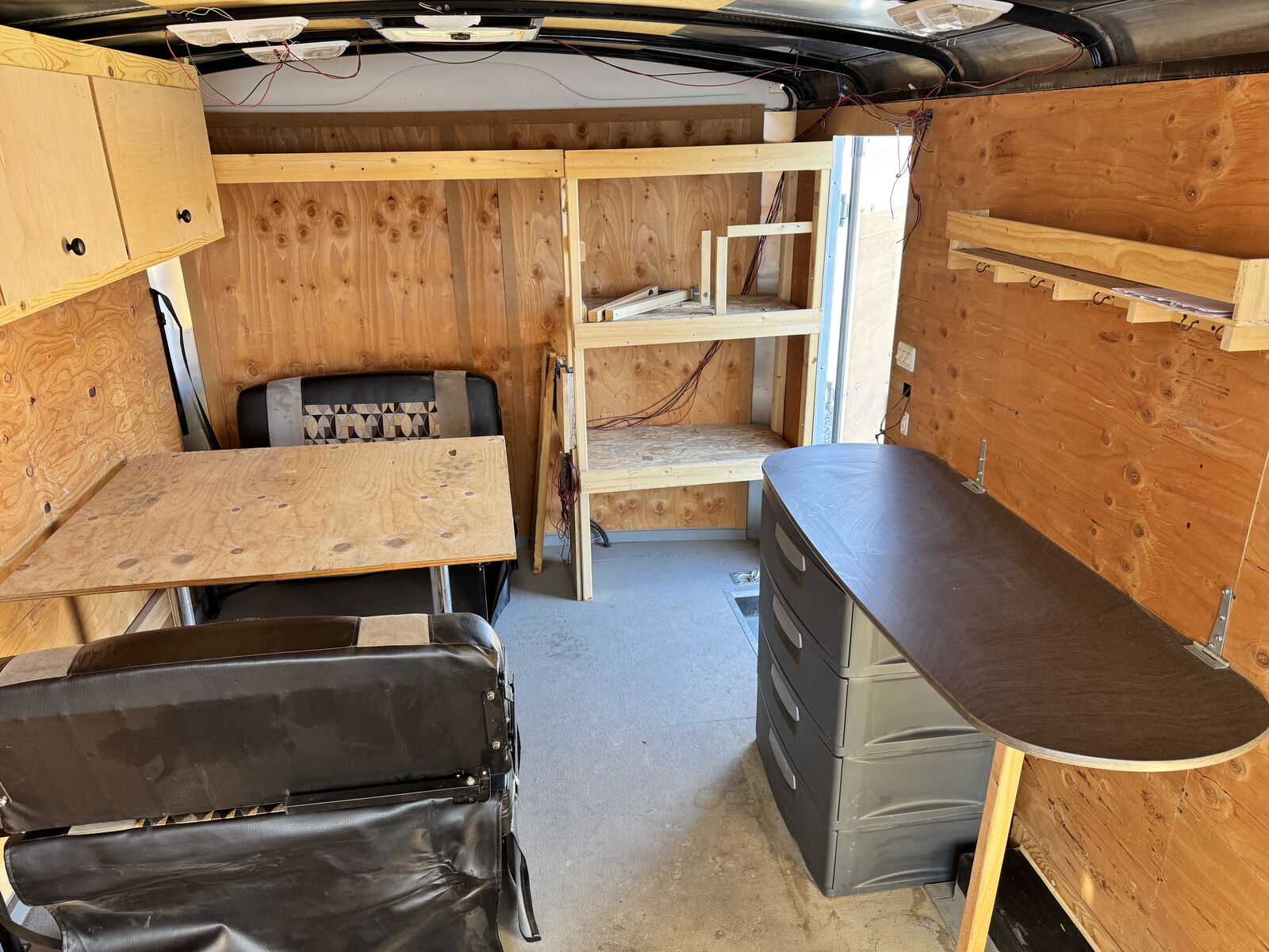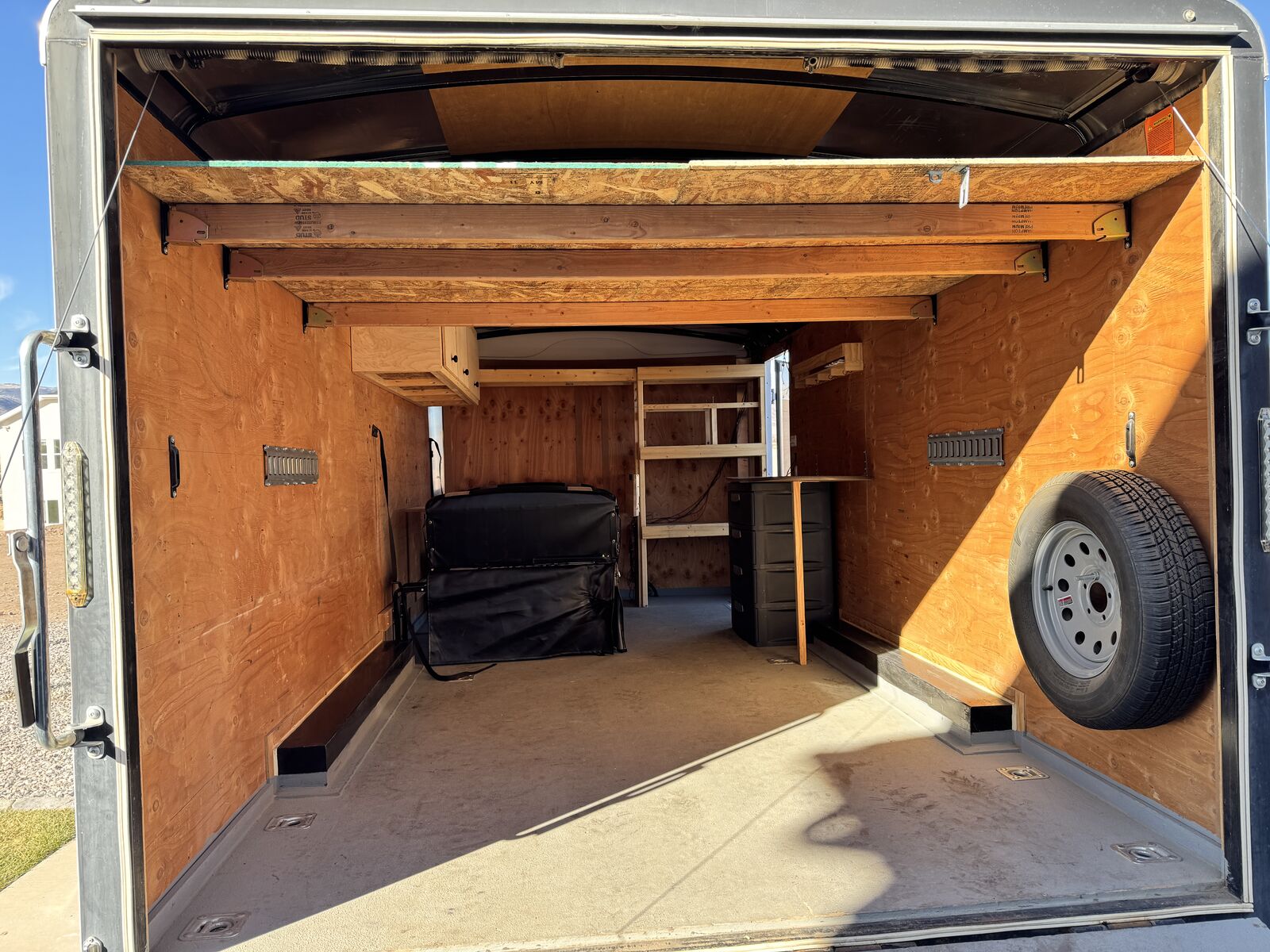 Interior: · Ceiling vent with installed vent hood (leave vent open despite weather) · Textured protective flooring on both the ramp door and main floor · LED interior camp trailer lighting throughout that can be run from battery if installed. · Heavy-duty tie-downs installed in the floor · E-track system installed at the rear o Upper position for secure 'out of the way' gear storage o Lower position configured for sleeping o 16’ L x 8’ W platform. Door opening is 92 1/4” w x 72 3/4” t. 83” between wheel wells inside. · Built-in shelving unit with microwave opening (framed in) · Cabinets installed for organized storage · Plastic drawers · Fold-down table for workspace or food prep area · Fold-down dinette that converts into a sleeper, including dinette table. Small fold up nightstand next to battery monitor and usb/110 charger ports for electronics charging. · Wall mounted spare tire at the rear for easy access despite loaded trailer